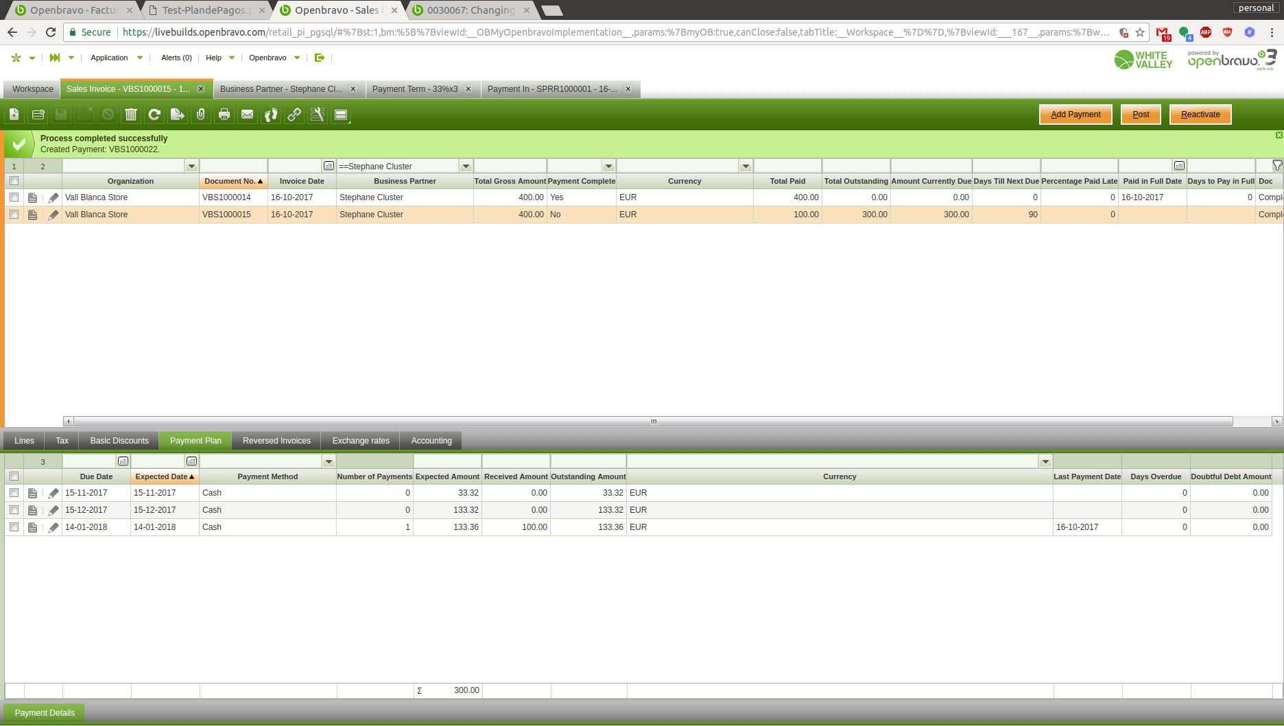 Check the created sales invoice has three payment plans (see attachment wrongPaymentPlanExample2.png):