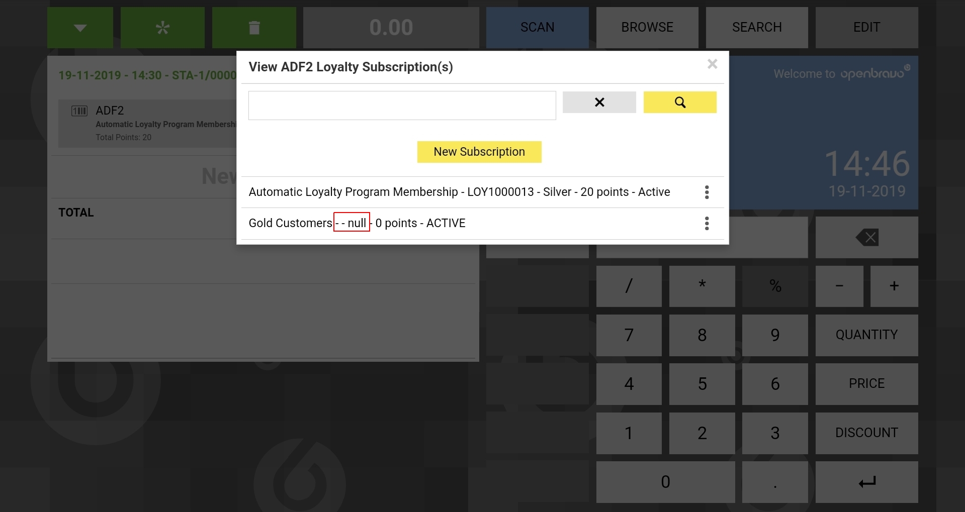 | Steps To Reproduce | PRECONDITION: "Loyalty Programs" and "Loyalty Programs for Web POS" modules must be installed. -- In the ERP: perform basic setup for Loyalty Programs (as shown in the OB Wiki page: http://wiki.openbravo.com/wiki/Projects:Loyalty_Programs/User_Guide#Who_can_subscribe_clients.3F [^]) 0. Log in the ERP and change the role to "The White Valley Group Admin" 1. Go to "Channel - Touchpoint Type" an open a record in form (p.e. VBS POS Terminal Type) 2. In the "Loyalty" section, check the "Enable Loyalty Features" box, and check the newly shown "Can Subscribe to Loyalty Programs" box 3. Go to the "Document Sequence" window, and create a new record for the "The White Valley Group" organization 4. Go to "Loyalty Program" window and create a new record and subtab records with the previously created document sequence set in the "Member Identifier Sequence" field -- In the POS 0. Log in a terminal belonging to the loyalty program enabled terminal type; in this case, VBS-1 1. Create a new customer by using the "* New Customer" button in the "Assign a customer" popup. 2. Go into Offline mode by disconnecting/disabling the active network connection of the device in use, and by navigating to the profile details of the dropdown menu if needed. 3. Click on the contextual button (three vertical dots) on the previously created customer, and click on the "View Details" option. 4. In the "Customer details" window try to add a "Loyalty Card" by clicking in the orange "plus" shaped button at the bottom 5. Click on the "New Subscription" button and follow the indications in the prompted popups to create a new subscription 6. Save the newly added subscription, and close all of the popups back to the "Assign a customer" popup 7. Go back into Online mode by reconecting 8. Repeat steps 3 and 4, to show the subscriptions 9. In the "View <new customer> Loyalty Subsctiption(s)" popup, check that the record with the subscription and it's details from the "View details" contextual menu option show as in the attached screenshots NOTICE that the subscription is correctly synced to the backend in the "Subscriptions" subtab of the previously created "Loyalty Program", with properly generated Member ID value, and its corresponding subscription Category field. But neither are shown in the POS, unless an incremental or masterdata refresh is performed. | |||||||||||