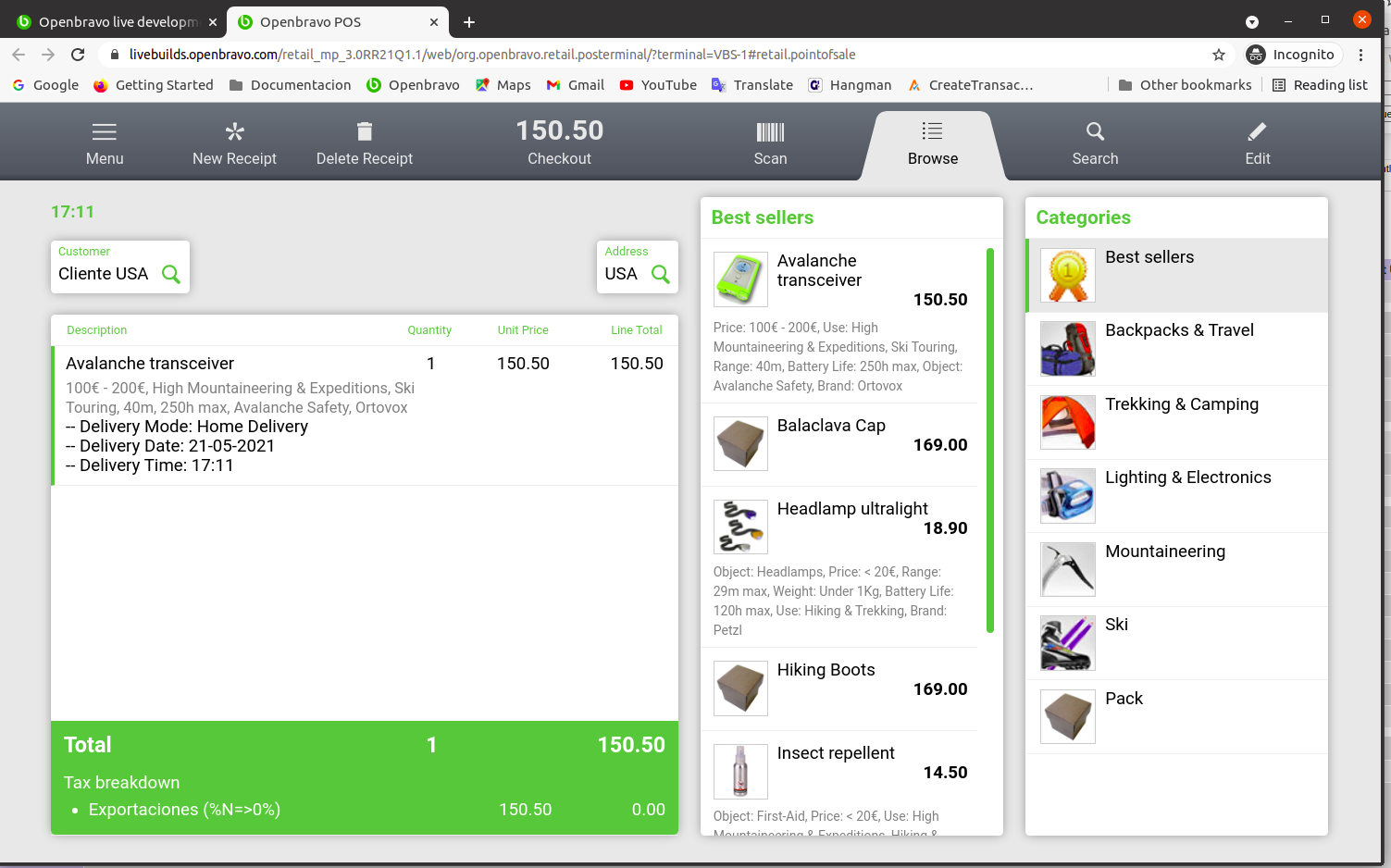 Test Plan Backoffice configuration: - Enable the preference "Web POS Enable Delivery Modes". - Go to product window and configure "Avalanche Transceiver" as "Home Delivery". - Go to business partner window and create a customer do NOT exempt, located in France. Create another one do NOT exempt, located in the USA. - Go to Busines partner window and create a new customer Exempt, and located in Spain (do not add any Region). - Go to Product window and set "Exento" tax category to the product Headlamp Ultralight. - Go to Tax Rate window and verify that below listed tax rates are configured as tax exempt: Ventas Exentas, Ventas exentas (%N=>0%),Entregas intracomunitarias (%N=>0%) y Exportaciones (%N=>0%). Test 1 Go to Web POS. Create a new sale for the French Customer. Select the product Avalanche Transceiver. Verify that the tax rate "Entregas intracomunitarias (%N=>0%)" is shown. This is correct as Delivery Mode is Home Delivery. Select Balaclava Cap. Verify that the tax rate shown is "Entregas IVA 21%". This is correct as Delivery Mode is Pick&Carry. Select Headlamp Ultralight. Verify that the tax rate shown is "Ventas Exentas" as this product is related to an exempt tax category. Test 2 Create a new sale for the USA Customer. Select the product Avalanche Transceiver. Verify that the tax rate "Exportaciones %N=>0%)" is shown. This is correct as Delivery Mode is Home Delivery. Select Balaclava Cap. Verify that the tax rate shown is "Entregas IVA 21%". This is correct as Delivery Mode is Pick&Carry. Select Headlamp Ultralight. Verify that the tax rate shown is "Ventas Exentas" as this product is related to an exempt tax category. Test 3 Create a new sale for the Anonymous customer (NOT exempt) Select the product Avalanche Transceiver. Verify that the tax rate "Entregas IVA 21%)" is shown. This is correct as Delivery Mode is Home Delivery, and its address is Spain. Select Balaclava Cap. Verify that the tax rate shown is "Entregas IVA 21%". This is correct as Delivery Mode is Pick&Carry. Select Headlamp Ultralight. Verify that the tax rate shown is "Ventas Exentas" as this product is related to an exempt tax category. Test 4 Create a new sale for the exempt customer (Exempt) Select the product Avalanche Transceiver. Verify that the tax rate "Ventas exentas (%N=>0%)" is shown. This is correct as the product belongs to Normal VAT, but the customer is exempt, and located in Spain. Select Balaclava Cap. Verify that the tax rate shown is "Ventas exentas (%N=>0%)". This is correct as the product belongs to Normal VAT, but the customer is exempt, and located in Spain. Select Headlamp Ultralight. Verify that the tax rate shown is "Ventas Exentas" as this product is related to an exempt tax category. |