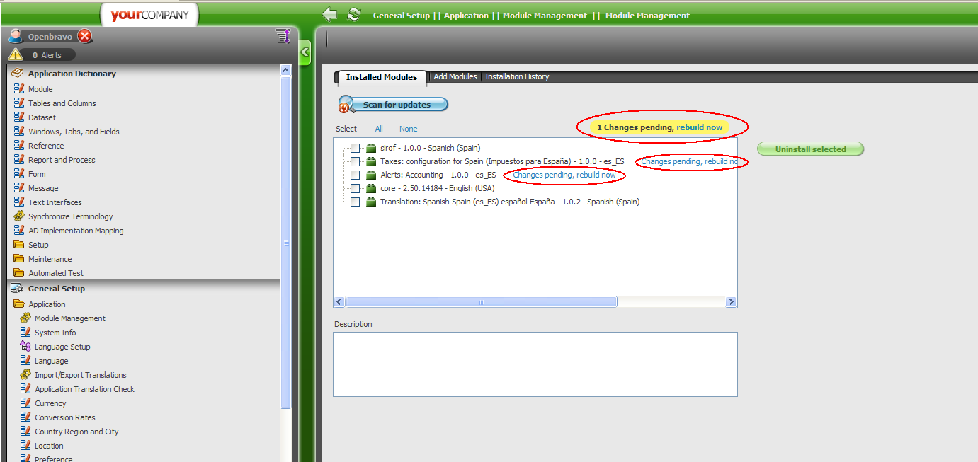 | Steps To Reproduce | 1. Login as System administrator 2. Go to General setup->Application->Module management 3. Move to add modules and install: 3.1 Alerts:Accounting 3.2 Taxes: configuration for Spain (impuestos para españa) 4. SEE ATTACH | |||||||