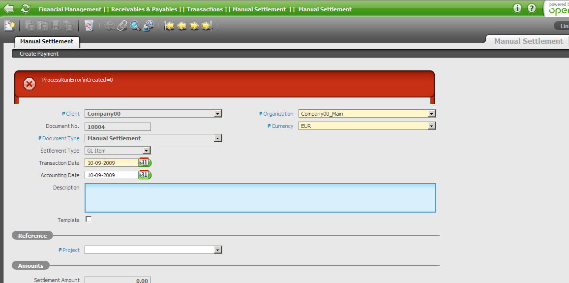 | Summary | 0010547: Manual Settlement: Error message 'ProcessRunError\nCreated=0' is not descriptive for non-direct posting trying to Post | |||||||
