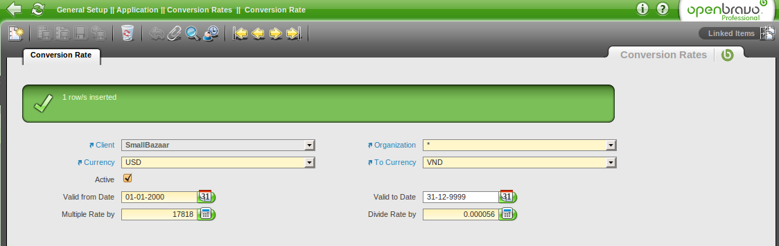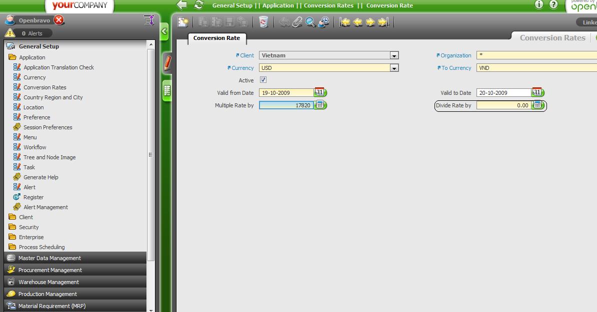 | Description | I live in Vietnam. Indeed, We only use VNĐ in G/L and all other kind of foreign currency must be converted into VNĐ according to exchange rate from goverment announce in the morning each day. The fact, our currency value is so low value compared with others and USD or UER are the comment currency which be chosen in commercial transactions. This is the current exchange rate between USD and EUR with VNĐ (Oct 19, 2009) - 1 USD = 17818 VNĐ - 1 EUR = 27019 VNĐ, By default currency conversion set up in Openbravo, From currency "USD" to "VNĐ" Mutiple 17818 divide 0 From currency "EUR" to "VNĐ" Mutiple 27019 divide 0 Finally, i made purchases invoice and sales invoice ==> Post, the system book correct value in VNĐ Afterward, I created one bank statement, the system also got correct payment or collection. Then, i progress with settlement. Unfortunately, Openbravo used divide value set up to calculate conversion rate for transactions, So, It cannot book any value for payment and double value bank transit for collection. | |||||||