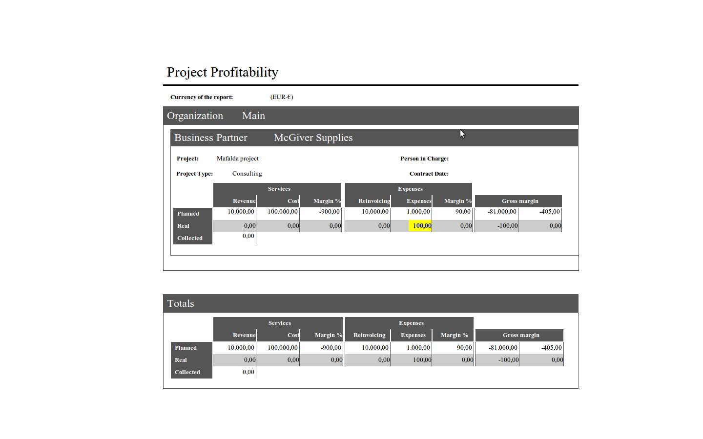 A new cell will be added Real Outsourced (RO): Invoiced purchase orders associated to services purchased for achieving the project (outsourced services). In other words, purchase invoice lines which product is of type Service. Real Expenses (RE): Invoiced purchase orders associated to collateral expenses of a project (taxis, hotels, ...). In other words, purchase invoice lines which product is of a type DISTINCT to Service. Planned Cost (PC): During a project, employee cost may vary until it reaches a fixed amount. Nevertheless, until all time sheets related to this project have been processed, one can not know how many employee hours have been really spent on it and which was their total cost. PC cell will be over both RE and RO cell. Ask Pablo Sarobe about the look & feel. Besides, the functional documentation will have to be updated http://wiki.openbravo.com/wiki/Functional_Documentation/Project_and_Service_Management#Project_Profitability [^] |