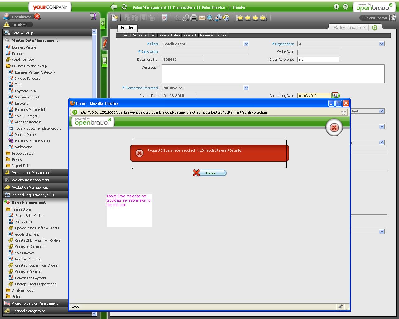 | Steps To Reproduce | Login with user having access to Openbravo admin role Navigate to Sales invoice window (Sales Management || Transactions || Sales Invoice || Header) Click “New” to create a new record Then Select • BP: Millman Ltd. And verify the below details are getting filled automatically, once the user selects the BP • Price List: General Sales • Currency: EUR • Form of Payment: Money Order • Payment Terms: Immediate Change the payment Terms field from Immediate to “One Month” Navigate to “Lines” tab Click “New” to create new line item details • Product: Hammer • Qty: 10 • Net unit Price: 5.80 • Tax: VAT 16% Move back to “Header” tab Verify the amount details • Total Net Amount: 58.00 • Total Gross Amount: 67.28 Click “Complete” button “Process Completed Successfully” message appears Move to Payment tab, and verify one line with a due date Line 1: Due date: 05/04/2010 and Amount: 67.28 Move to Payment Plan tab and verify the schedule event appears Line 1: Due date: 05/04/2010 and Expected Amount: 67.28 Then move back to header tab and click “Add Payments From Invoice” button Enter '67.28' in "Actual Payment" field verify the There is a difference of field is removed Then un select the line item check box, then line item become read only Click “Process” button and then click “OK” button System throws error message which is too technical and not meaningful | |||||||