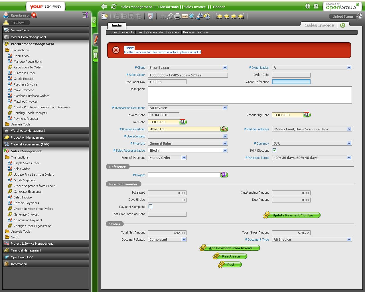 | Steps To Reproduce | Create and complete the invoice Then click reactivate button, System shows below error message "Error: Another Process for this record is active, please unlock it" | |||||||
