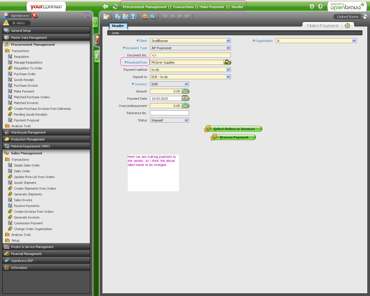 DescriptionIn Make payment window, Receive from field label needs to be changed.