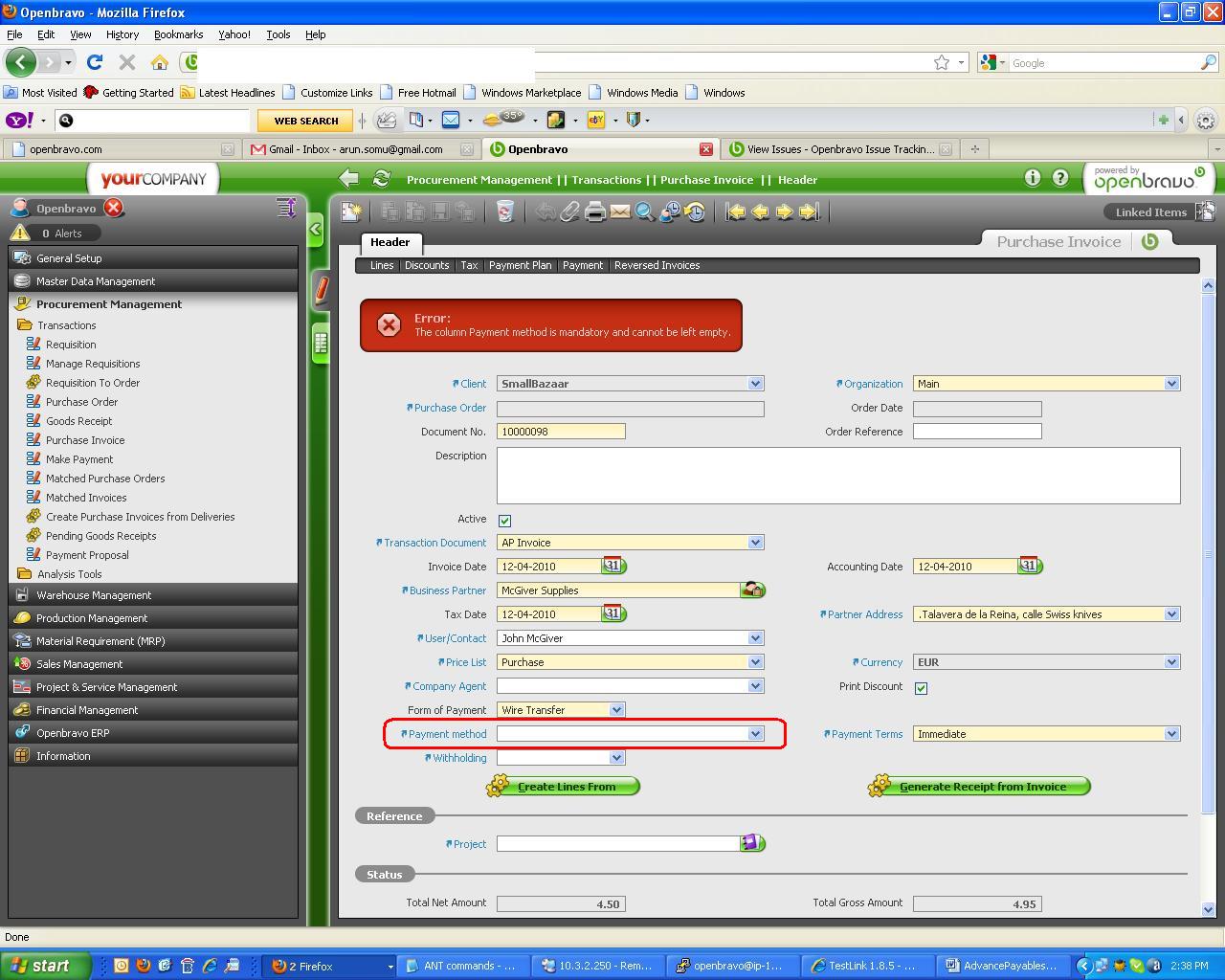 | Steps To Reproduce | • Login with user having access to Openbravo Admin Role • Navigate to Procurement Management -> Transactions -> Purchase invoice • Click New to create a new record • Select the Transaction document as “AP Invoice”. • Invoice Date is current system date • Select the business partner • Do not Select the Payment method • Move to tab Lines and click New. • Click on the product icon. Popup window must show up. • Select the product • Move to header and complete. You will see an error message "The column Payment method is mandatory and cannot be left empty." | |||||||