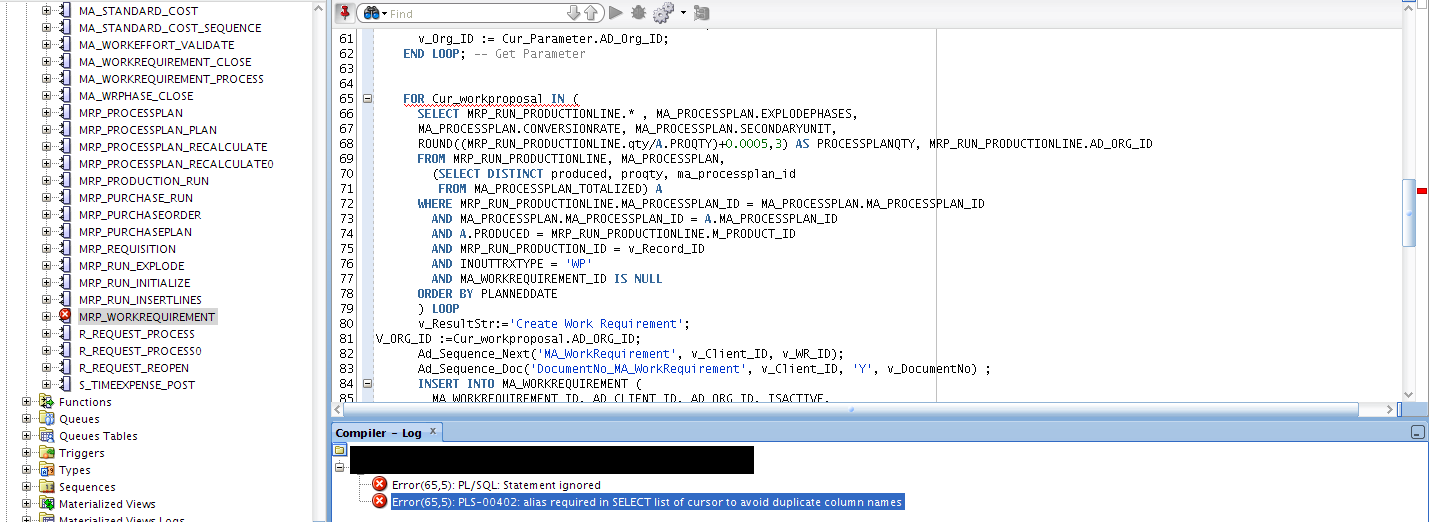 | Steps To Reproduce | 1) With SQL Developer open procedure MRP_WORKREQUIREMENT Error(65,5): PLS-00402: alias required in SELECT list of cursor to avoid duplicate column names | |||||||