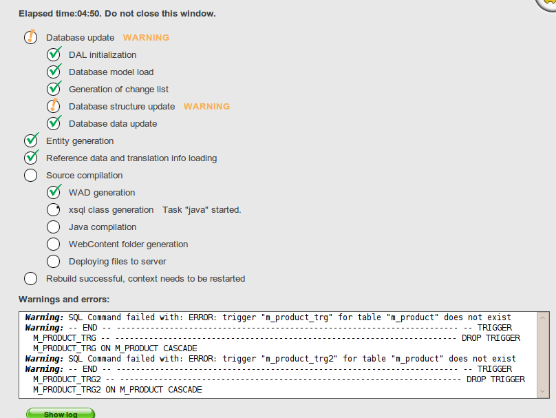 [java] 78125 INFO - Executed 71 SQL command(s) with 2 error(s)