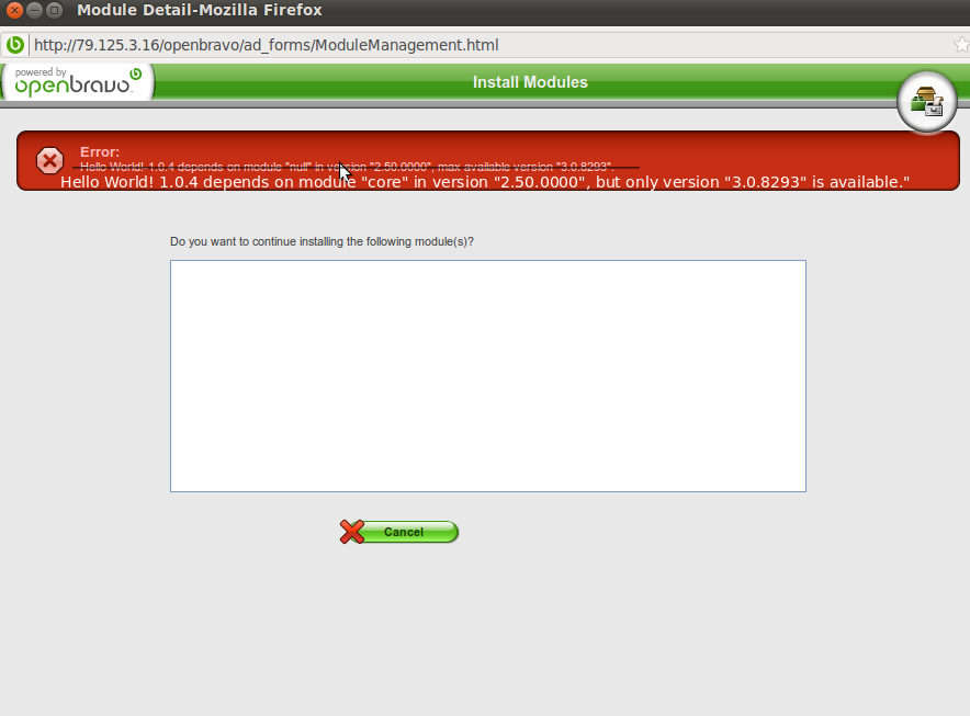 | Steps To Reproduce | login on a Openbravo 3.0 RC2 context. Go to General Setup > Application > Module Management Go to add modules tab Click Browse File System Select Hello World 1.0.6 (<http://forge.openbravo.com/projects/helloworld/module> [^]) and click continue. | |||||||