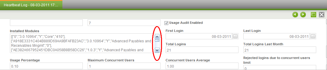 | Description | The Heartbeat Log tab is by default disabled, meaning that all its fields are read only. However, the "installed modules" field's content required scrolling, what is not possible in a disabled field. See attach. | |||||||
