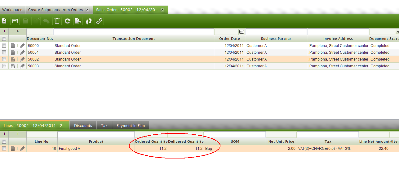 | Steps To Reproduce | Login with: "User name": Openbravo "Password": openbravo Change the role to QA Testing Admin Go to Sales management || Transactions || Sales order Click New and select: "Transaction Document": Standard Order "Business partner": Type CUSA and press enter key. Customer A value should be showed instead Once you have the business partner Customer A in place, verify: "Partner Address": .Pamplona, Street Customer center nº1 "Invoice Address": .Pamplona, Street Customer center nº1 "Invoice terms": Customer Schedule After Delivery "Warehouse": Spain warehouse "Price List": Customer A "Payment method": 1 (Spain) "Payment Terms": 30 days, 5 Click Save and move to lines Click new and type FGA for the product and press Enter key. Verify: "Product": Final good A "UOM": Bag "Net Unit Price": 2.00 "Net List Price": 2.00 "Tax": VAT(3)+CHARGE(0.5) "Line Net Amount": 2.00 Change the "Ordered Quantity" to 11.2 and verify the "Line Net Amount" is 22.40 Click Save and move back to the Header tab Click Complete button and press OK Go to Sales management || Transactions || Sales order Click New and select: "Document Type": MM Shipment "Business partner": Type CUSA and press enter key. Customer A value should be showed instead Once you have the business partner Customer A in place, verify: "Partner Address": .Pamplona, Street Customer center nº1 "Warehouse": Spain warehouse "Price List": Customer A, 5 Click "Create Lines From". A pop-up gets opened. Do: Click the Warehouse icon and select the record (spain111) Select the sales order created in [SALa010] In the grid it will appear one record. Marl the record and press the OK button A green success message will appear: Process completed successfully Move to Lines tab. Select the record and enter in form view Click the icon for the product. A pop-up will be opened. Select the record and press OK Verify: "Attribute Set Value": L56 "Storage bin": spain111 "Movement Quantity": 11.2 Click Save and move back to the Header tab Click Complete button Press OK and verify: A green success message appears: Process completed successfully "Document Status": Completed At this point side effects in: 1. If you go to "Create Shipments from orders" you can still see the order although has been fully delivered. 2. If you try to create the sales invoice based on this order you cannot because the Sales order is not in the combo box 3. If you go again to "Create shipment from orders" and pick it again you have a new shipment with qty=1 !!!!!!! 4. If you go again to the sales invoice and click "Create lines from" you now see the order. You select it and complete but has two lines!!. See attach twolines.png 5. But the worst thing is that the order will remain in the combo box forever and if you select it you have a line with qty=0. | |||||||