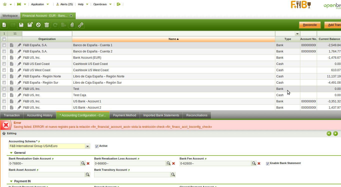 | Steps To Reproduce | Navigate to an existing Financial Account - Accounting Configuration and then select "Enable Bank Statement". Do not enter any account in the Bank Asset Account / Bank Transitory Account fields Save. The screen attached shows the message | |||||||