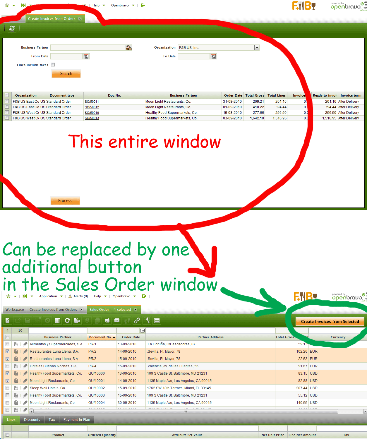 | Proposed Solution | Validation can be done upfront or after pressing the button. TBD. Here some ideas for the Create Invoices from Order process: - filters are set as implicit filter. As this task belongs to a specific role you can set these filters per role - filters are not set at at all. You just select a few orders and hit the "Create invoices from selected" button and then all selected objects are checked for their status. Then, if some records are not eligible, you can either overrule (e.g. creating an invoice now already, in spite of having set the invoice terms to x days) or skip. We could ask the user at this point. - you can also create invoices per line. Makes it easy to do partial invoicing | |||||||||||