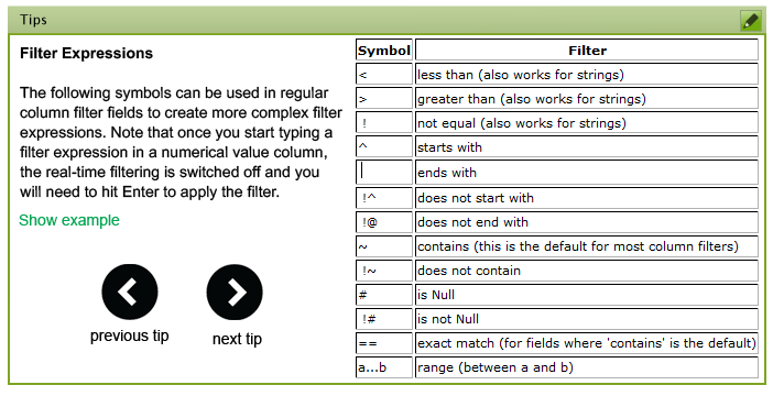 | Description | it would be good to inform the user and train them about new and advanced features. Good example is filter expressions that have a steep learning curve. | |||||||||||