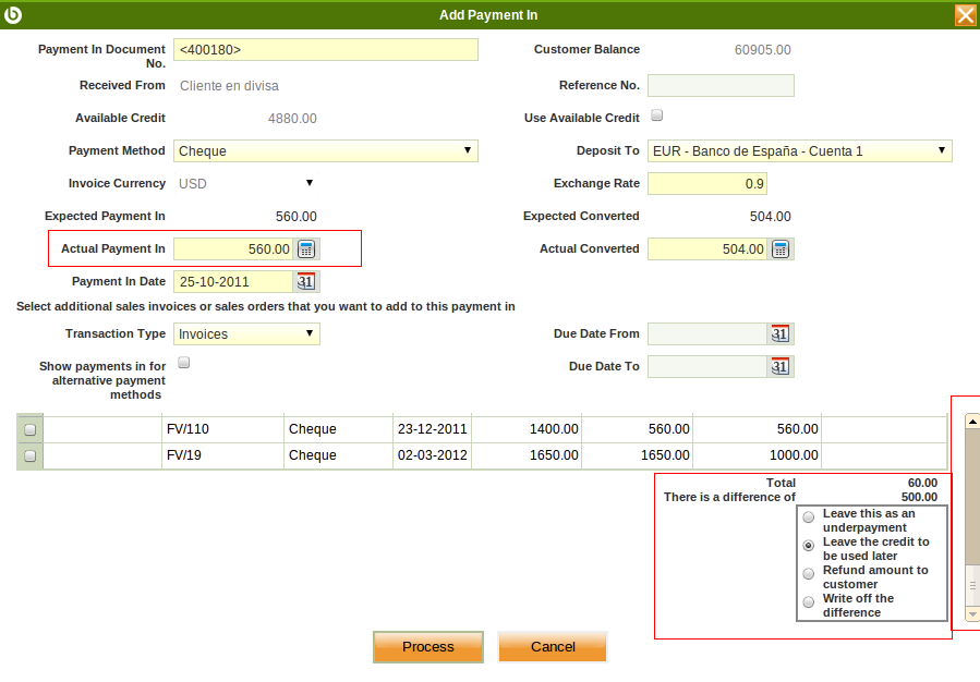 | Steps To Reproduce | Create a sales invoice to a BP (Customer) who does have a payment term including 3 steps, by example (20% 15 days - 40% 30 days and rest 60 days), and also who has a price list linked in a different currency (USD) than the Organization Accounting Schema currency (EUR): Complete and Post. Realize that the total amount is equal to 1400,00 USD by example. Add a payment in by using the Add Payment In/Out button. A new window is shown. Instead of changing the amount in the field "Actual Payment In" (1400,00), unmark the last one schedule payment, realize that the field "expected converted" and "actual converted" are correct base on the sum of the 2 first line * exchange rate applicable. Also make sure you have many lines shown in the grid, so you do not see the botton of it where Openbravo shows below values: "Leave this as an underpayment" "Leave the credit to be used later" "Refund the amount to customer" "Write Off the difference"..as shown in the screen below. Process the payment. Navigate to Payment In window and realize that the 3rd scheduled payment has been marked as credit without any advice to the end-user. | |||||||||||
