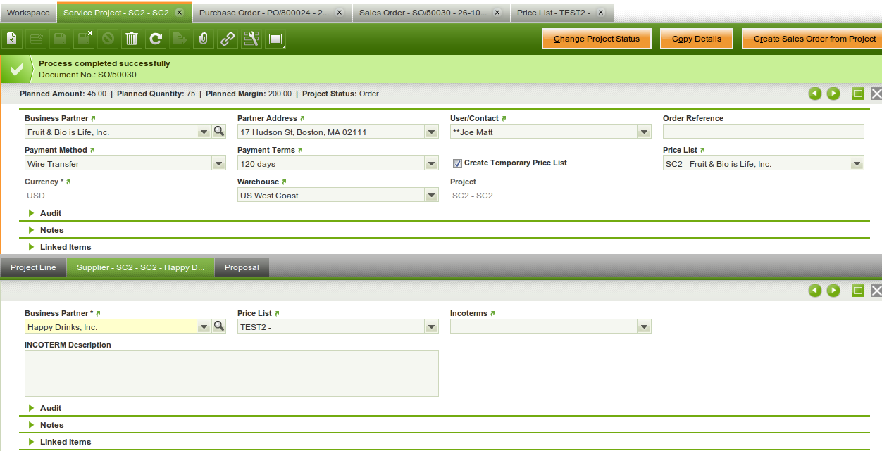 Test Plan: Enter a Service Project with in the main tab: BP: Moonlight Restaurant Payment Method: Wire Transfer Payment Terms: 30 days select 'Create Temporary Price List' In the project Line tab enter: Product: Ale Beer Quantity: 10 Planned SO Net Unit Price: 0.80 Planned PO Net Unit Price: 0.60 Supplier tab: BP: Happy Drinks Price List: Happy Drinks Price List Proposal Tab: Proposal 1: BP: Be Soft drinker Payment Method: Cash Payment Terms: 60 days Proposal Line tab: Line 1: Product: Apple Juice Quantity: 20 Net Unit Price: 1.00 Line 2: Product: Apple Juice Bio Quantity: 30 Net Unit Price: 0.75 Back in the Proposal Tab: Proposal 2: BP: Fruit & Bio Payment Method: Check Payment Terms: 120 days Proposal Line tab: Line 1: Product: Apple Juice Quantity: 25 Net Unit Price: 0.80 Line 2: Product: Cola Quantity: 50 Net Unit Price: 0.50 It is then decided that the 2nd proposal is the winner. You select the 2nd proposal and click Process a winning bid. After that you change the status of the project to Order. Notice that the supplier have the correct pricelist. |