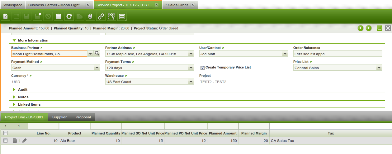 | Steps To Reproduce | Enter several service projects for example for Moonlight and select the option to create temporary price lists. Change the status to Order and create the purchase and sales orders for these service projects. Now indepedantly go to the sales order screen and enter a sales order for Moonlight. Check if the price list 'General Sales' appears as a selectable value in the price list list : for me that value was not displayed, just the temporary pricelists that were created for the service projects. See screenshots | |||||||