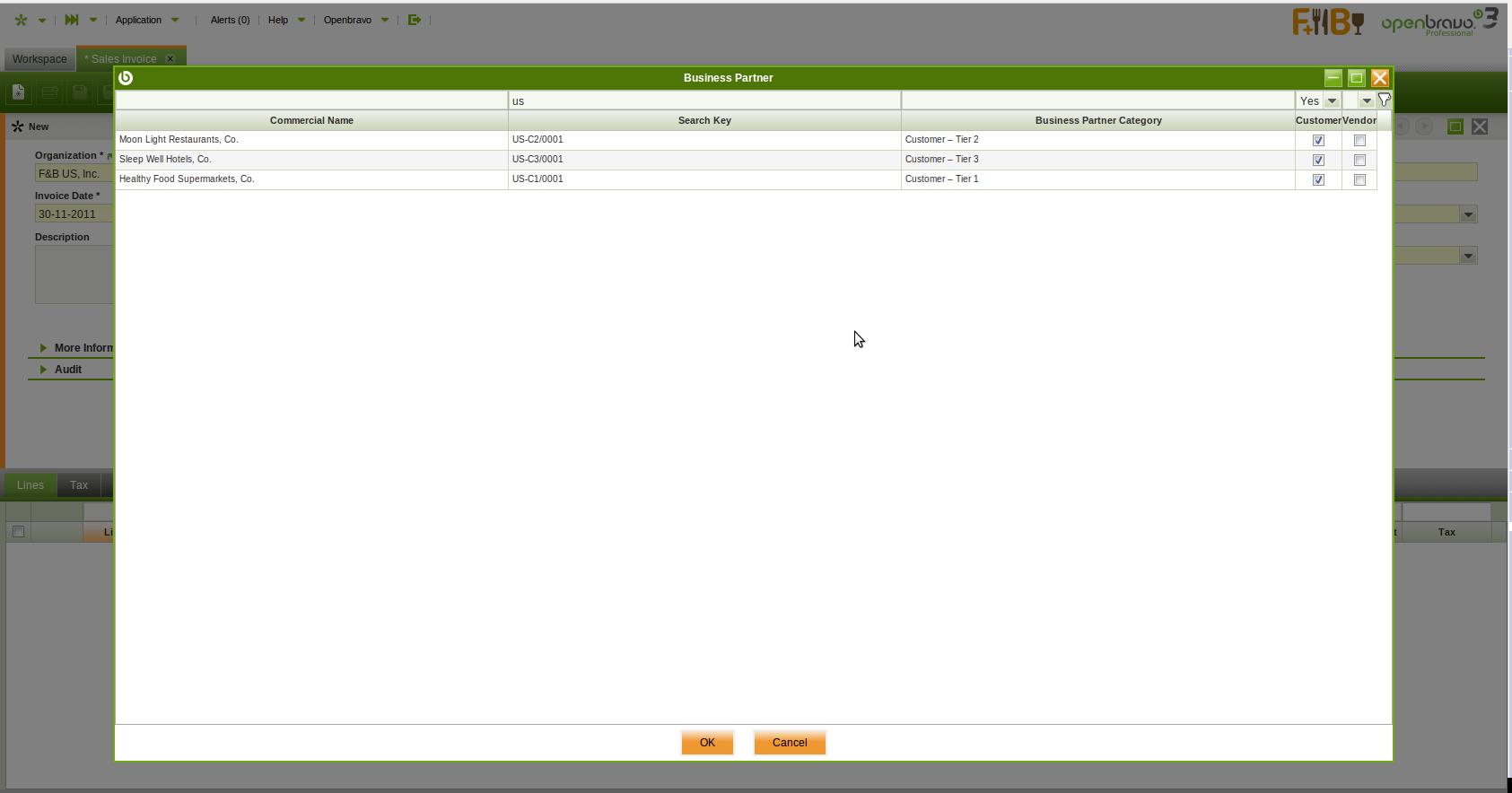 | Steps To Reproduce | Go to "Database": -Go to table "C_invoice", and create one column with the next expecications: +costeheader numeric(10,0) DEFAULT 30 -Go to table "C_bpartner" and create one field with the next expecification: +coste numeric(10,0) DEFAULT 10 Now go to the application as "System administrator": -Go to "Tables and Columns" window. -Choose the table "C_bpartner" and push in button "Create Columns from DB" (the application said that one column is added). -Now choose the table c_invoice and push again the button "Create Columns from DB" (one column will be added). -Also in this table, go to column "Business Partner" and change the reference [reference.png] -After that, go to "Reference" window and find the record whose name is "Business Partner selector". -Navigate to tab "Define Selector--> Defined Selector Field" -Create new field [field.png] -After that, go to window "Windows, tabs, and Fields" and find the window "Sales Invoice". -Inside the window "Sales Invoice", select the tab header and push in button "Create Fields" (one field will be added). -Open this field "Costeheader" and put it in the combo "Selector Out Field" the value "coste". -Shut down tomcat and turn on. Now as "Group Admin" go to window "Sales Invoice" and create a Header. -Push in the icon "magnifying glass" of the "Business Partner" selector you will see that you don't see nothing because we have create the column coste with default value of 10 and we are prefiltering by 30[empty.png] -Now, as "System Administrator", go to window reference and to the record whose name is "Business Partner selector", tab "Define Selector--> Defined Selector Field" and choose the field that we have define previously. -Uncheck the checkbox "Show in Grid" -Now come back again as "Group Admin" to the "Sales invoice" Window, create a headre and push in the "magnifying glass" of the "Business Partner". You will see empty but if you write something in any filter, the default filter is out.[full.png] | ||||||||||