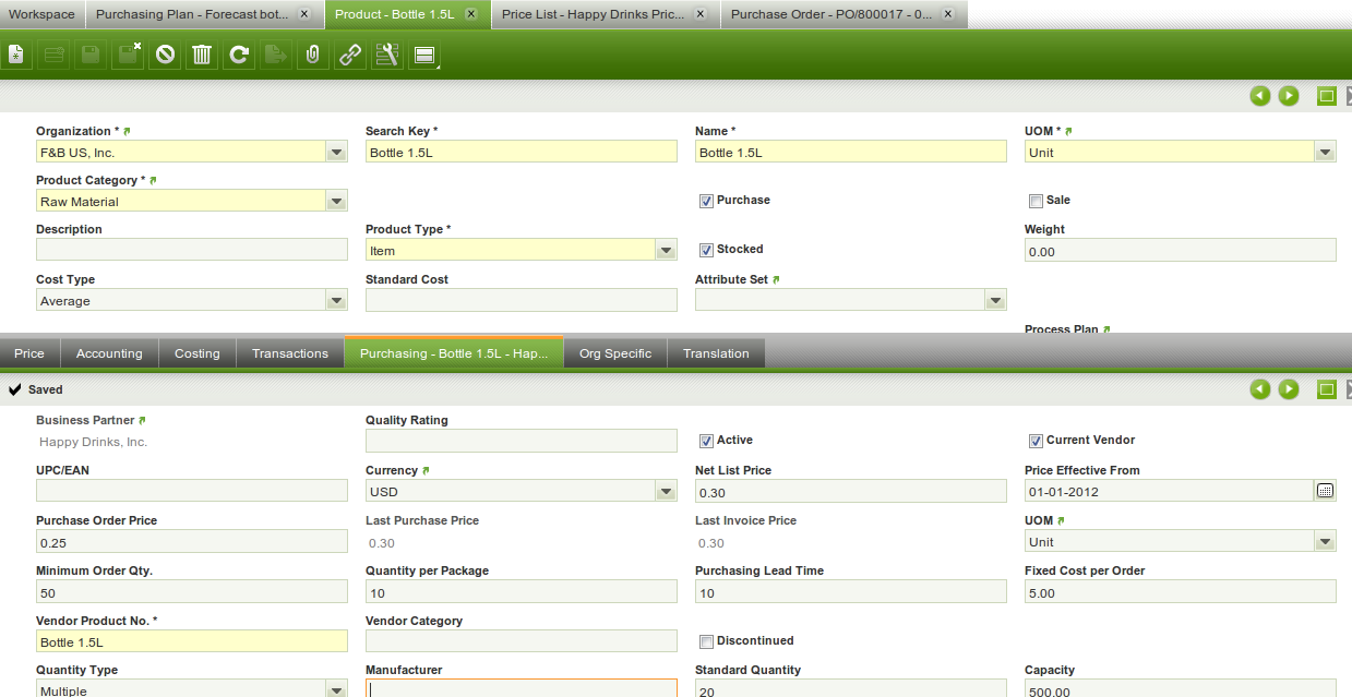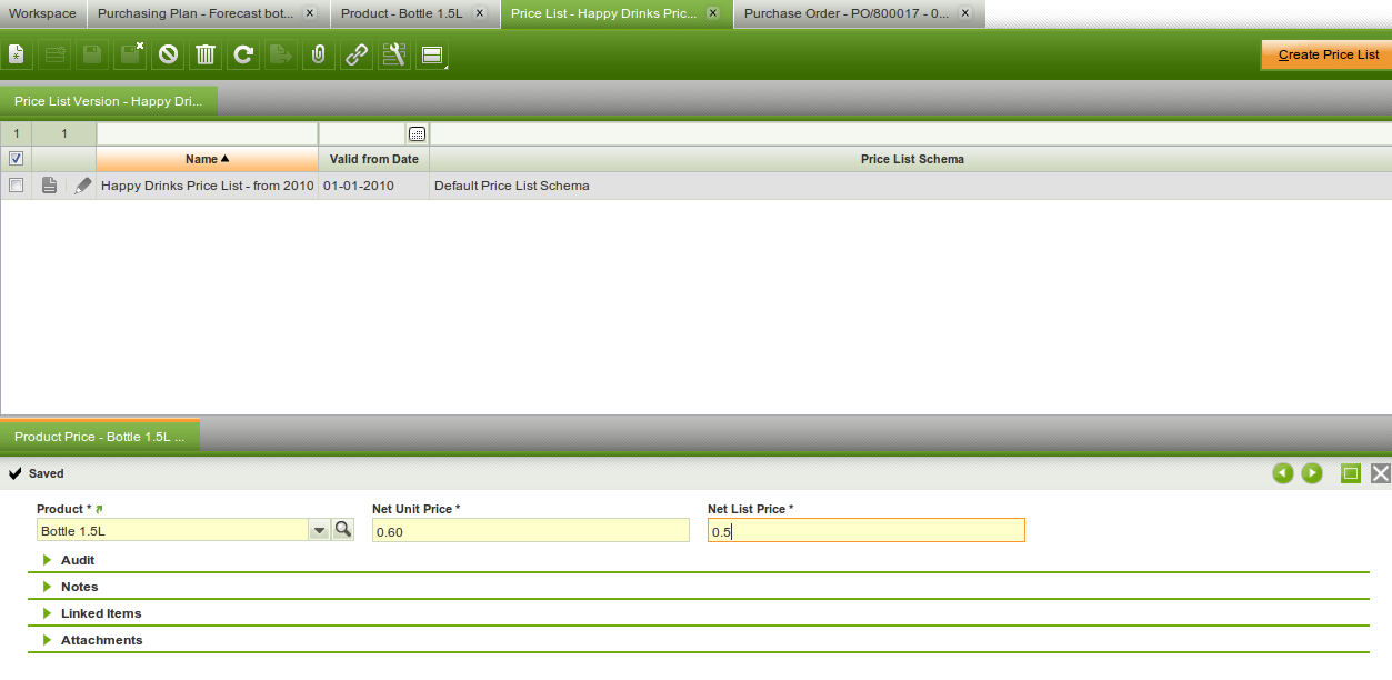 Steps To ReproduceEnter a product that is purchased. Enter a price for a certain vendor for the product. In the purchasing tab you select that vendor and enter a different Purchase Order Price and Net List Price than what is on the price list.