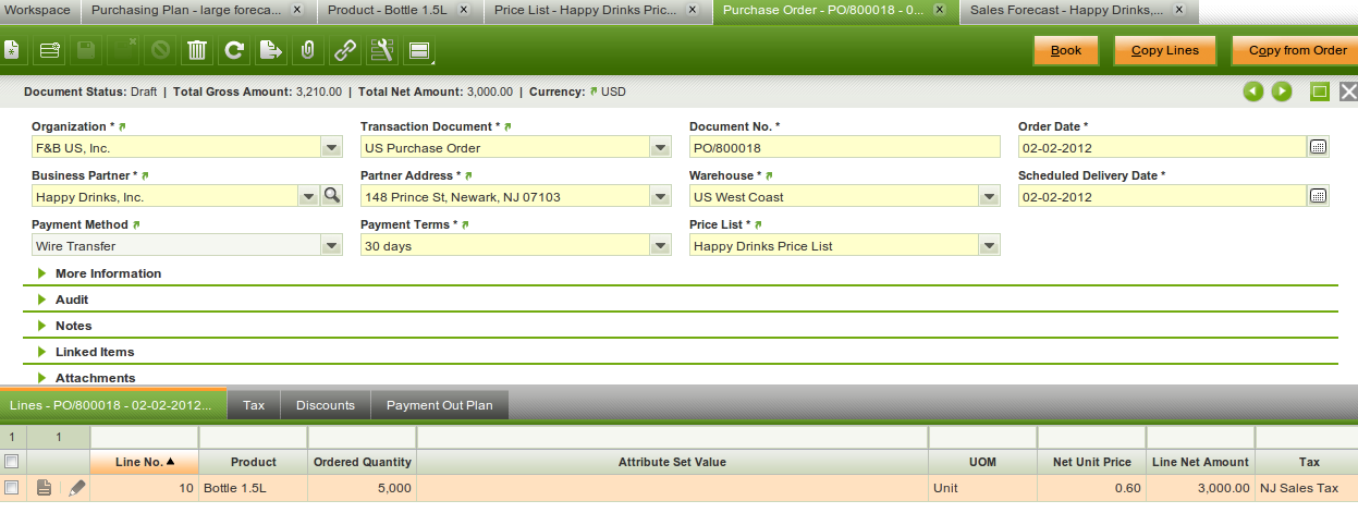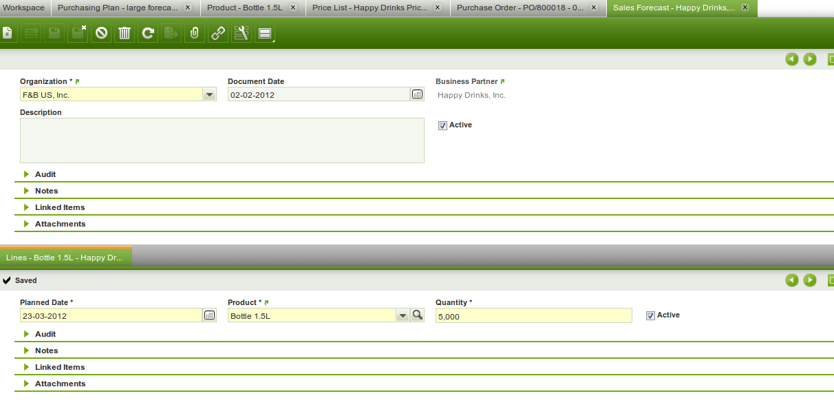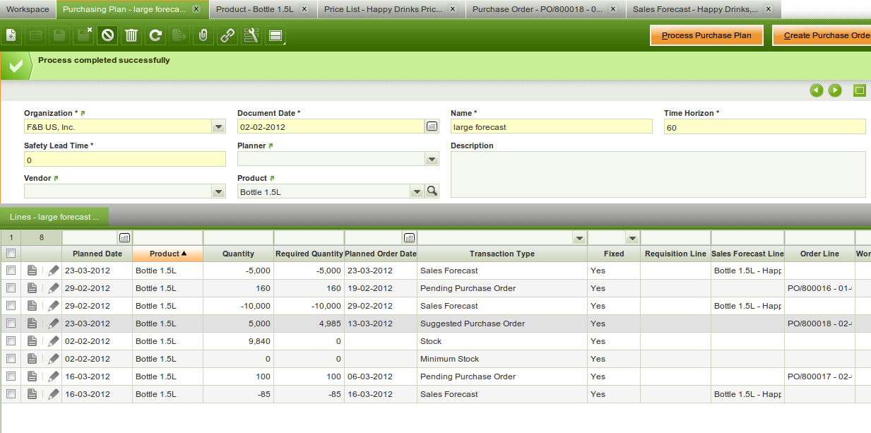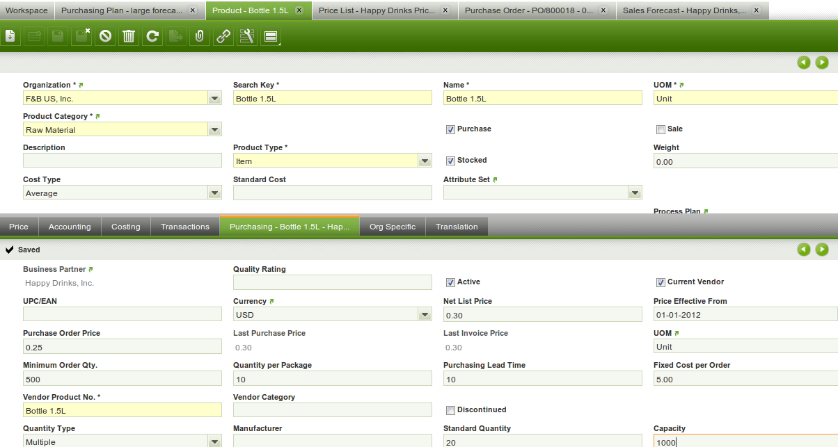 | Steps To Reproduce | See screenshots. Enter a product that is purchased. Enter the Purchasing tab with the following information: Purchasing leadtime = 10, Capacity = 1000. Now you enter a sales forecast for that product for that vendor for 5000 with a future date. What should happen is that in the Purchasing Plan there are 5 lines for 1000 each for the dates (forecast due date - 10 days) for the first 1000, (forecast due date - 11 days) for the second 1000, (forecast due date - 12 days) for the third 1000 etc. I checked with Aurora and she said the Purchase order may have 5 lines, but that was also not the case. | |||||||||||
