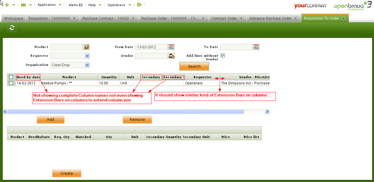 DescriptionIn Requisition to Order window, below the filters it shows Table in which columns such as 'Need by Date','Secondary Quantity'&'Secondary Unit' not completely displayed.