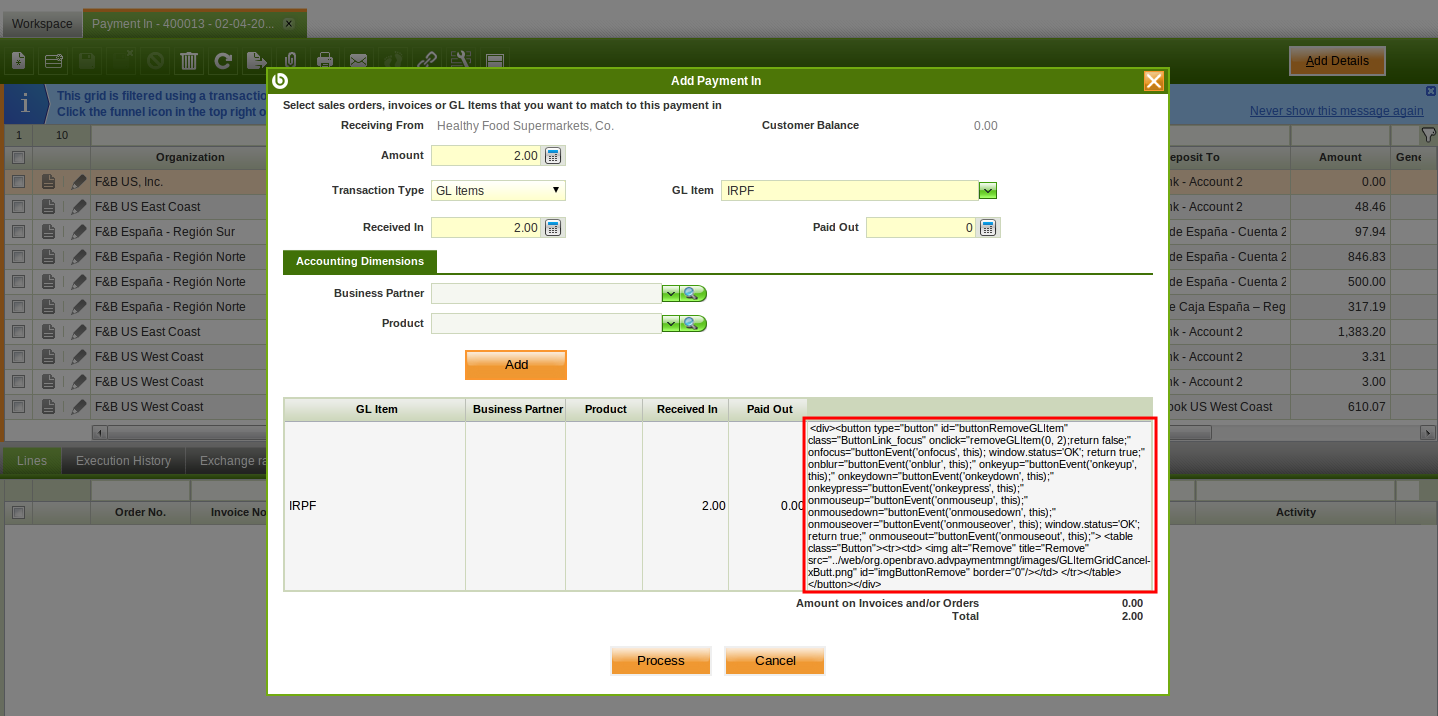 | Summary | 0020187: Adding a GL Item to the payment: remove icon is not displayed (only the HTML code) | |||||||