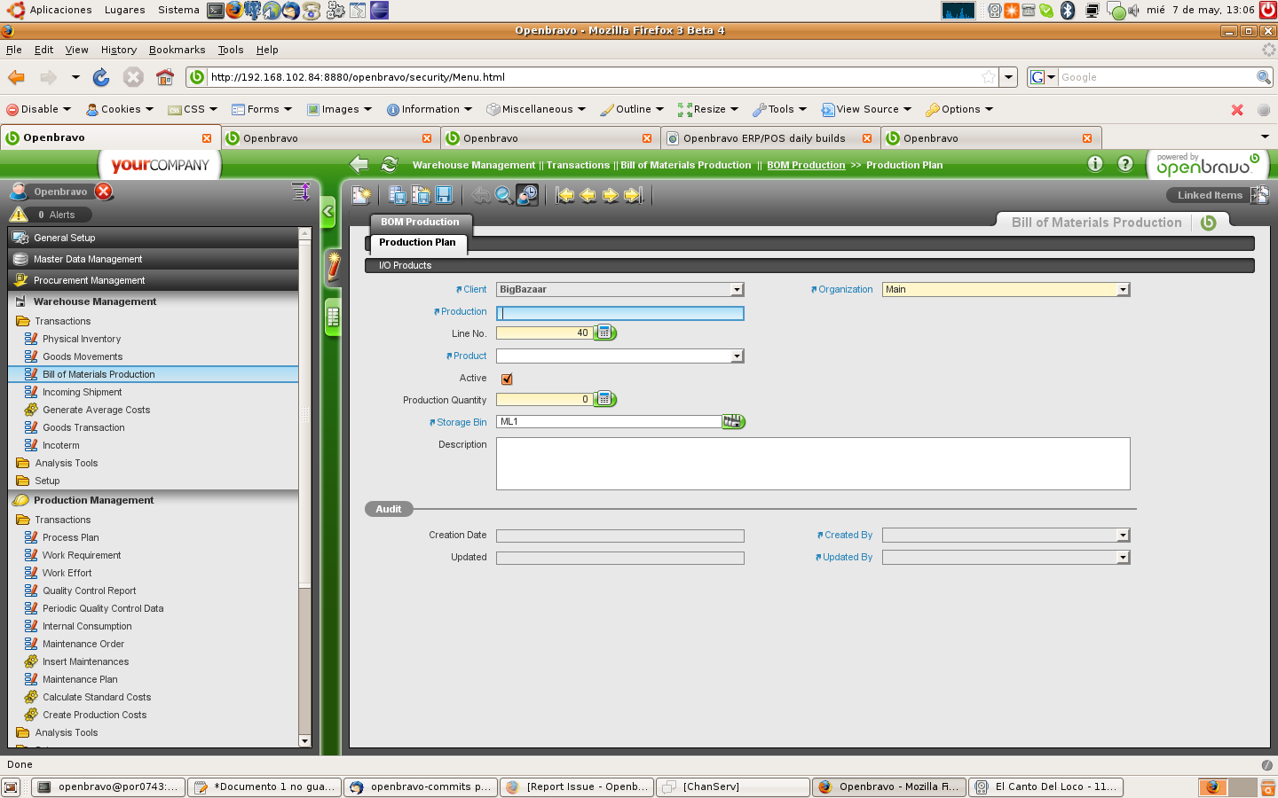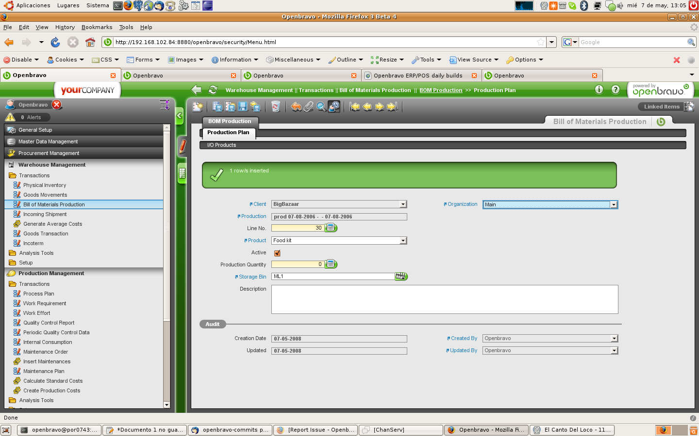 | defect | [Openbravo ERP] 05. Production management | minor | always | 2008-05-07 14:03 | 2009-03-18 11:01 | |||