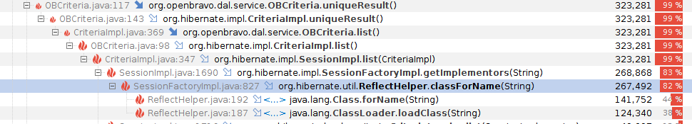 Note, that in the 20485 issue the performance hit was in the classloading, apparently the hibernate Criteria logic does a lot of getMappedClass calls which calls classloaders which is very slow. It can make sense to check this again, but ofcourse the issue can also be in other places... |