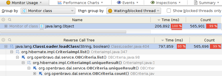 | Description | OBCriteria is still adding more overhead than OBQuery, after fix 0020485 it is slower. Note this measurement is just for overhead and not for query itself. Profiling attached test cases, it can be seen most of the time is spent in class loading triggered by Hibernate criteria (cpu-time.png). An additional problem is this classloading is synchronized by class name (lock-monitor.png), this in practice means, concurrent threads needs to wait these locks to be released in order to execute the criteria. The problem is the className SessionFactoryImpl.getImplementors receives [1] is not actually a classname but entity name, so ReflectHelper.classForName finally performs a locking Class.forName [2] [1] https://github.com/alostale/hibernate-orm/blob/3.6.3-patched/hibernate-core/src/main/java/org/hibernate/impl/SessionFactoryImpl.java#L827 [^] [2] https://github.com/alostale/hibernate-orm/blob/3.6.3-patched/hibernate-core/src/main/java/org/hibernate/util/ReflectHelper.java#L192 [^] | |||||||