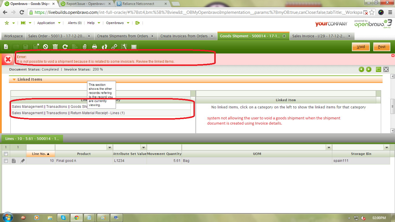 | Summary | 0022594: Not able to void a goods shipment when the shipment document is created using Invoice details | |||||||