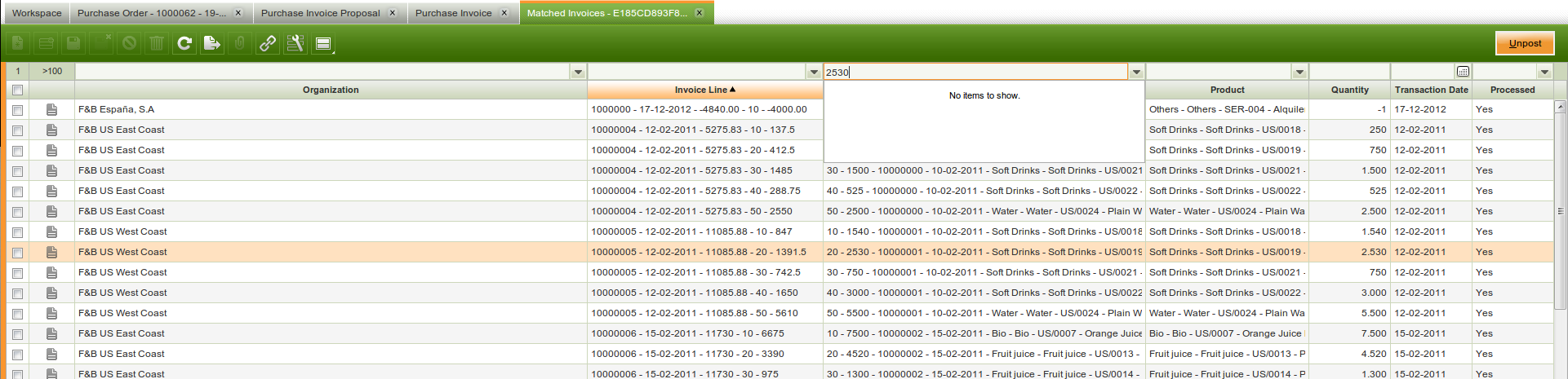 DescriptionWhen you type in "Invoice Line" and "Goods Receipt Line" grid filters it shows "No items to show" white box instead of the checkbox list to apply a multiple filter.