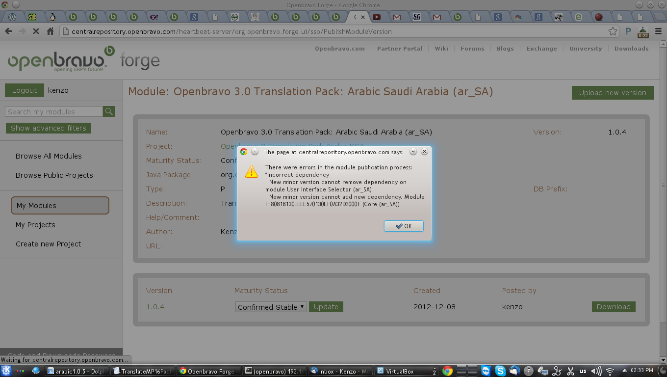 | Description | ---------- Forwarded message ---------- From: Kenzo Repole <kenzo.repole@kenzo-sa.com> Date: 31 December 2012 12:36 Subject: Re: Translation Core Depedency To: Dmitry Mezentsev <dmitry.mezentsev@openbravo.com> Dear Dmitry, Here is a screen shot of one of the problems I am having. I have done neither. I will also include the package here. | |||||||||||