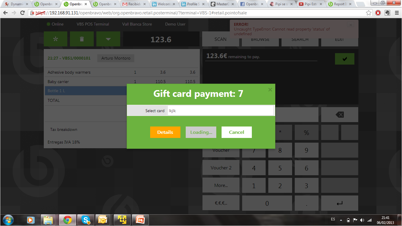 | Description | When trying to pay with a Gift Card and the entered identifier does not exist, a error message appears saying "Uncaught TypeError: Cannot read property 'status' of undefined". In addition, this message appears behind the focused pop-up and the user could not see it easliy Module version : 1.0.500 Openbravo for Retail : RMP19 | |||||||||||