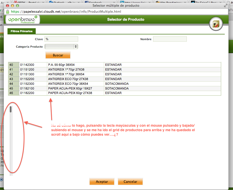 The problem is that Apple Magic Mouse / Trackpad completly hide the scrollbar (of any window), and it only appears in case it is needed. Since in the first moment the scroll bar is not present, the width is calculated without taking it into account, and once it is shown, it is shown below the grid. Even more, although in case it will be "shown" in the right side, the scroll won't be operable unless you scroll in the place where the scroll is supposed to be. At some moment, classic windows are going to be refactored, so it doesn't worth the effort to fix Dojo's Grid vs the effort to refactor the window/selector. A solution to fix the issue could be dissable Mac OSX special scroll: Here is a tutorial http://www.youtube.com/watch?v=kIeUvT6pRAM [^] |