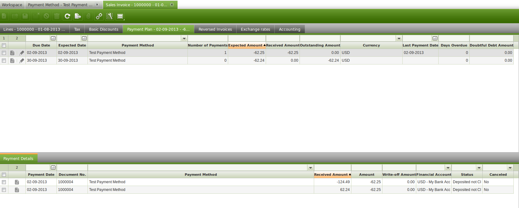 | Steps To Reproduce | Navigate to Payment Term window and create a new one having two payment lines, for instance 50% 30 days and 50% 60 days. Navigate to Business Partner window and associate that payment term to the customer "Healthy Food Supermarket" of the F&B US Inc organization. Create a Sales Order for a total of 45 units of a product. Book the order. Create the corresponding Goods Shipment for the 45 units of the product. Complete the shipment Create the corresponding Sales Invoice by using the button "Create Lines From" and select the shipment. Complete the invoice. Now the customer returns 5 units of the product. Create a Return from Customer order by selecting the goods shipment line of 45 units and specify as "returned" quantity 5. Create the Return Material Receipt document by selecting the return from customer line of -5 units. Navigate to the Sales Invoice and select the type "Return Material Sales Invoice". Select the -5 units to be invoiced by using the button "Create Lines From", "Shipment/Receipt" checkbox. Once completed, the payment schedule details of the invoice have not been properly created due to the split of negative amounts. For checking this you need to look into the database as it can not been seen as a user, unless the payment method is setup as described below: - Automatic Receipt = Yes - Automatic Deposit = Yes - Execution Type = Manual - Upon Receipt Use = Cleared Payment Account. See image attached. | |||||||