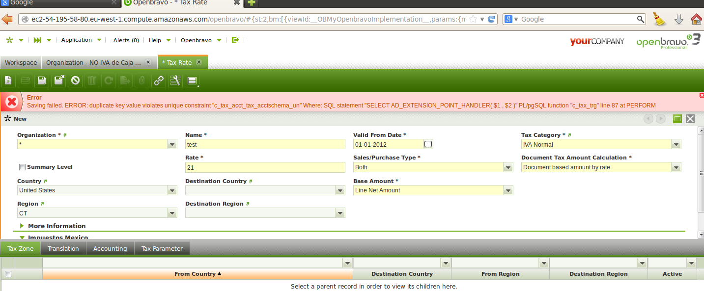 | Description | It is not possible to manually create a new tax rate while Timing of VAT booking is installed and taxes are applied to (*) organization and besides each organization have an accounting schema. | |||||||||||