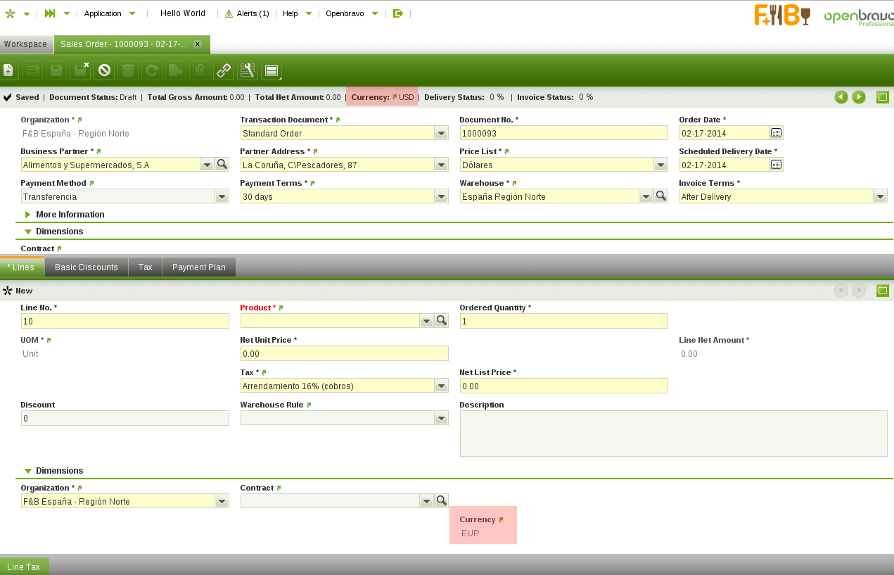 | Steps To Reproduce | * Add a new property based field to Lines tab on Sales Order window * The field will show the currency of the price list: order.priceList.currency * http://wiki.openbravo.com/wiki/How_to_use_property_fields [^] When testing: * Pick a organization with *no* default currency, or pick a price list with a different currency than the default for the organization * Create a new line, and you'll see that the currency field uses some default that is not the one selected in the header. Current behavior: * On 'NEW' mode, FIC will try to calculate a *default* value for that field, trying to pick a currency from the Organization or just the first one in the list of currencies, and *not* the actual value for the property in the header * If you save, you'll find that the value of the currency gets fixed to the one selected in the header | |||||||
