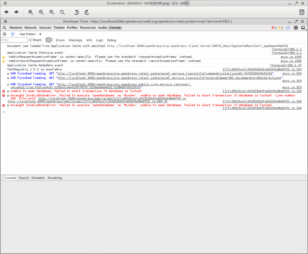 | 2014-08-24 21:26 | hgbot | Fixed in SCM revision | http://code.openbravo.com/erp/pmods/org.openbravo.mobile.core/rev/cec9d6e0345734ce30e39c288792ab7e89094046 [^] => http://code.openbravo.com/erp/pmods/org.openbravo.mobile.core/rev/0c46c6f83deabe0d407f80993a9768a5a9119118 [^] |