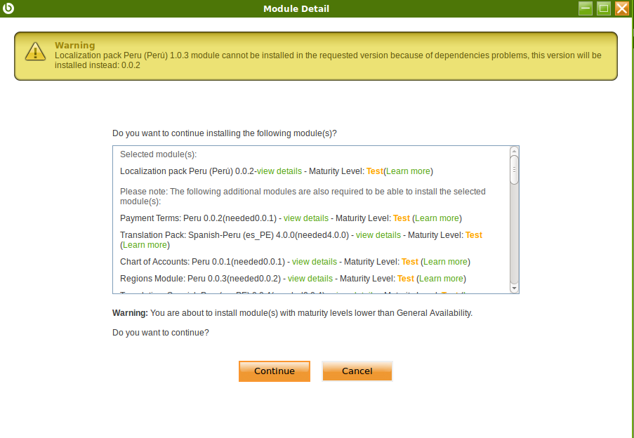 | Description | Not possible to install Peru Localization community edition, version 1.0.3, in a machine with Openbravo 3 PR14Q2.5 installed. See image attached. | |||||||||||