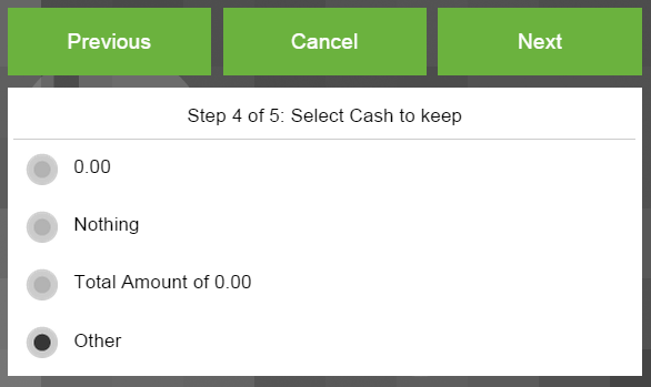 | Steps To Reproduce | Using an instance with no movements (i.e. recently built from an install source) log in as a regular user. Perform a Cash up, and get into the step 4: Cash to keep. Take a look at the options: ( ) 0.00 ( ) Nothing ( ) Total Amount of 0.00 ( ) Other From a user point of view, all the three options are the same. | |||||||||||