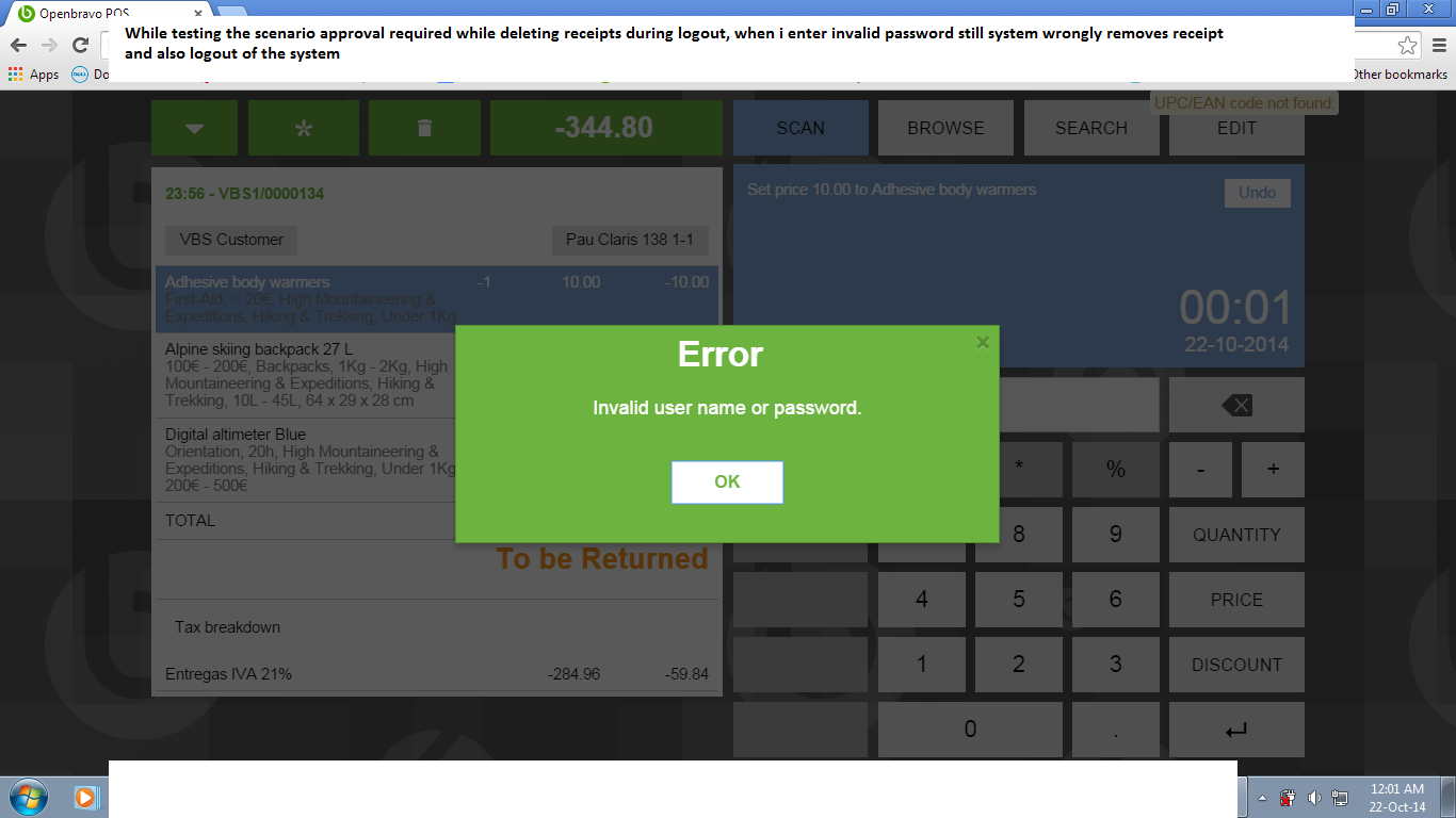 | Steps To Reproduce | Pre-condition: Login to ERP system using below user credentials: "Username": Openbravo "Password": openbravo Then change the role to “The White Valley Group Admin” role Navigate to “Preference” window Click Ctrl + D to add new record Then enter the below details “Client”: The White Valley Group "Organization": Vall Blanca Store “Property List”: Checked “Property”: Web Pos Remove Receipts Approval “Value”:Y Then In Visibility section, enter the below details “Visible at Client”: The White Valley Group "Visible at Organization": Vall Blanca Store “Visible at User”: Openbravo Click Ctrl + S to save the changes Then change the role to “System Administrator” role Navigate to “Preference” window Verify record is present for property “Web POS Remove Receipts Approval” If the record is found, set the field "value" to “Value”:N If the record is not found, then click Ctrl + D to add new record Then enter the below details “Client”: System "Organization": * “Property List”: Checked “Property”: Web Pos Remove Receipts Approval “Value”:N Then In Visibility section, enter the below details “Visible at Client”: <Blank> "Visible at Organization": <Blank> “Visible at User”: <Blank> Click Ctrl + s to save the changes. Steps: Login to POS terminal, go to the login URL: http://{server}/{context}/web/org.openbravo.retail.posterminal/?Test1 [^] Enter login credentials: "Username": vallblanca "Password": openbravo The POS window will appear. Add product Product: Alpine skiing backpack 27 L; Quantity: 1 no Product: Adhesive Body warmers; Quantity: 1 no And verify the below details Product: Alpine skiing backpack 27 L Qty: 1 Price: 109.90 Product: Adhesive body warmers Qty: 1 Price: 3.60 Total Gross Amount: 113.50 Tax Breakdown Tax percentage: Entregas IVA 21% Taxable Amount: 93.81 Total Tax amount: 19.69 Then to logout from web POS click “Drop down” menu and select “Online” option Verify below options appear in the “Online” popup Lock Screen End Session To logout, click “End Session” option and verify “Approval Required” popup appears, along with “Openbravo” user appears in approval list Enter as User id: “Openbravo” Password: Invalid password Then click “Approve” button Expected behavior: System should show warning message and remains in webpos screen (should not remove receipts and system should not logout). Actual behavior: Once the user enters wrong password, and press approve button ... "Invalid username and password" error message appears but system wrongly logout. Note: refer the screen shot for the error message. | |||||||