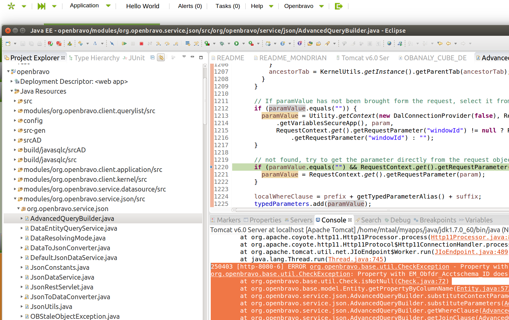 | Description | - a selector with a where clause with a parameter which is stored in the context, for example this where clause: e.active = true and exists (select 1 from FinancialMgmtAcctSchemaElement c where c.accountingSchema.id=@EM_Obfdr_Acctschema_ID@ and c.accountingElement.id = e.accountingElement.id) - the parameter name ends with _ID therefore the advancedquerybuilder tries to resolve it against a entity which does not work - the exception is actively ignored and the next if will get the value correctly from the context. This is correct. The problem is that the log shows an error while the value is present in the context correctly. 250403 [http-8080-6] ERROR org.openbravo.base.util.CheckException - Property with EM_Obfdr_Acctschema_ID does not exist for entity OBANALY_Cube_Rep_Dim org.openbravo.base.util.CheckException: Property with EM_Obfdr_Acctschema_ID does not exist for entity OBANALY_Cube_Rep_Dim at org.openbravo.base.util.Check.isNotNull(Check.java:72) at org.openbravo.base.model.Entity.getPropertyByColumnName(Entity.java:572) at org.openbravo.service.json.AdvancedQueryBuilder.substituteContextParameters(AdvancedQueryBuilder.java:1200) at org.openbravo.service.json.AdvancedQueryBuilder.substituteParameters(AdvancedQueryBuilder.java:362) at org.openbravo.service.json.AdvancedQueryBuilder.getWhereClause(AdvancedQueryBuilder.java:209) at org.openbravo.service.json.AdvancedQueryBuilder.getJoinClause(AdvancedQueryBuilder.java:1302) at org.openbravo.service.json.DataEntityQueryService.buildOBQuery(DataEntityQueryService.java:125) at org.openbravo.service.json.DataEntityQueryService.list(DataEntityQueryService.java:108) at org.openbravo.service.json.DefaultJsonDataService.fetch(DefaultJsonDataService.java:200) at org.openbravo.service.datasource.DefaultDataSourceService.fetch(DefaultDataSourceService.java:72) at org.openbravo.service.datasource.DataSourceServlet.doFetch(DataSourceServlet.java:261) at org.openbravo.service.datasource.DataSourceServlet.doPost(DataSourceServlet.java:744) at javax.servlet.http.HttpServlet.service(HttpServlet.java:637) at org.openbravo.base.HttpBaseServlet.serviceInitialized(HttpBaseServlet.java:225) at org.openbravo.base.secureApp.HttpSecureAppServlet.service(HttpSecureAppServlet.java:449) at org.openbravo.client.kernel.BaseKernelServlet.callServiceInSuper(BaseKernelServlet.java:92) at org.openbravo.client.kernel.BaseKernelServlet.service(BaseKernelServlet.java:63) at org.openbravo.service.datasource.DataSourceServlet.service(DataSourceServlet.java:140) at javax.servlet.http.HttpServlet.service(HttpServlet.java:717) at org.apache.catalina.core.ApplicationFilterChain.internalDoFilter(ApplicationFilterChain.java:290) at org.apache.catalina.core.ApplicationFilterChain.doFilter(ApplicationFilterChain.java:206) at org.codehaus.enunciate.webapp.HTTPRequestContextFilter.doFilter(HTTPRequestContextFilter.java:36) at org.apache.catalina.core.ApplicationFilterChain.internalDoFilter(ApplicationFilterChain.java:235) at org.apache.catalina.core.ApplicationFilterChain.doFilter(ApplicationFilterChain.java:206) at org.openbravo.client.analytics.OBSpringSecurityContextRequestFilter$1.doAction(OBSpringSecurityContextRequestFilter.java:71) at org.openbravo.dal.core.ThreadHandler.run(ThreadHandler.java:46) at org.openbravo.client.analytics.OBSpringSecurityContextRequestFilter.doFilter(OBSpringSecurityContextRequestFilter.java:79) at org.apache.catalina.core.ApplicationFilterChain.internalDoFilter(ApplicationFilterChain.java:235) at org.apache.catalina.core.ApplicationFilterChain.doFilter(ApplicationFilterChain.java:206) at org.openbravo.activiti.OBActivitiRequestFilter$1.doAction(OBActivitiRequestFilter.java:68) at org.openbravo.dal.core.ThreadHandler.run(ThreadHandler.java:46) at org.openbravo.activiti.OBActivitiRequestFilter.doFilter(OBActivitiRequestFilter.java:81) at org.apache.catalina.core.ApplicationFilterChain.internalDoFilter(ApplicationFilterChain.java:235) at org.apache.catalina.core.ApplicationFilterChain.doFilter(ApplicationFilterChain.java:206) at org.openbravo.utils.SessionExpirationFilter.doFilter(SessionExpirationFilter.java:66) at org.apache.catalina.core.ApplicationFilterChain.internalDoFilter(ApplicationFilterChain.java:235) at org.apache.catalina.core.ApplicationFilterChain.doFilter(ApplicationFilterChain.java:206) at org.openbravo.utils.CharsetFilter.doFilter(CharsetFilter.java:35) at org.apache.catalina.core.ApplicationFilterChain.internalDoFilter(ApplicationFilterChain.java:235) at org.apache.catalina.core.ApplicationFilterChain.doFilter(ApplicationFilterChain.java:206) at org.openbravo.client.kernel.KernelFilter$1.doAction(KernelFilter.java:62) at org.openbravo.dal.core.ThreadHandler.run(ThreadHandler.java:46) at org.openbravo.client.kernel.KernelFilter.doFilter(KernelFilter.java:71) at org.apache.catalina.core.ApplicationFilterChain.internalDoFilter(ApplicationFilterChain.java:235) at org.apache.catalina.core.ApplicationFilterChain.doFilter(ApplicationFilterChain.java:206) at org.openbravo.dal.core.DalRequestFilter$1.doAction(DalRequestFilter.java:81) at org.openbravo.dal.core.ThreadHandler.run(ThreadHandler.java:46) at org.openbravo.dal.core.DalRequestFilter.doFilter(DalRequestFilter.java:103) at org.apache.catalina.core.ApplicationFilterChain.internalDoFilter(ApplicationFilterChain.java:235) at org.apache.catalina.core.ApplicationFilterChain.doFilter(ApplicationFilterChain.java:206) at org.apache.catalina.core.StandardWrapperValve.invoke(StandardWrapperValve.java:233) at org.apache.catalina.core.StandardContextValve.invoke(StandardContextValve.java:191) at org.apache.catalina.core.StandardHostValve.invoke(StandardHostValve.java:127) at org.apache.catalina.valves.ErrorReportValve.invoke(ErrorReportValve.java:102) at org.apache.catalina.core.StandardEngineValve.invoke(StandardEngineValve.java:109) at org.apache.catalina.connector.CoyoteAdapter.service(CoyoteAdapter.java:298) at org.apache.coyote.http11.Http11Processor.process(Http11Processor.j
