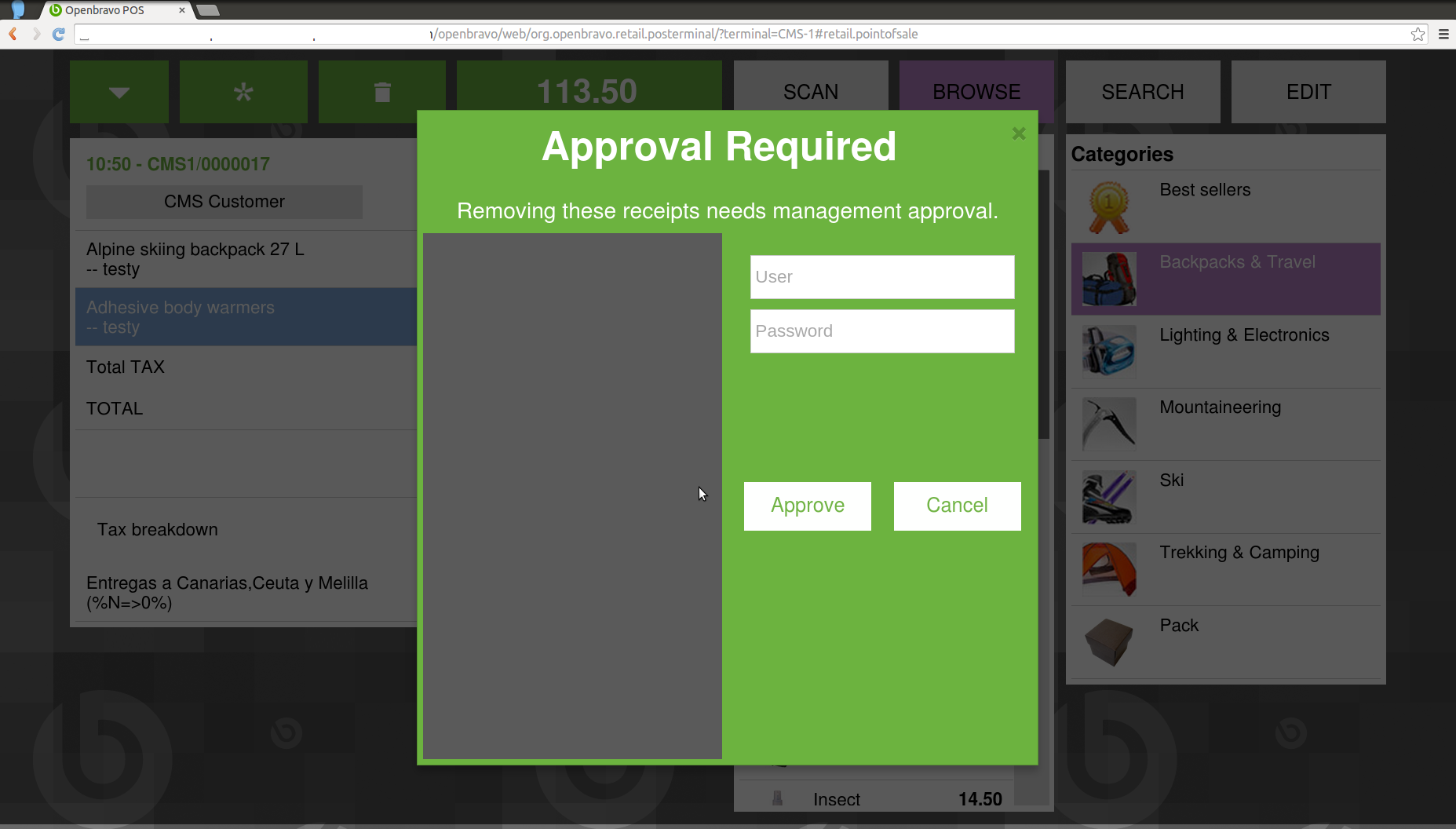 | Steps To Reproduce | I assume that you are using CMS-1 terminal. Setting approval: In POS backend, log in as Openbravo/openbravo. Use "The White Valley Group Admin" role. Go to Preference window and create a new record: - Organization: Central Mountains Store Property: Web POS Remove Receipts Approval Value: N Visible at Client: <blank> Visible at Organization: Central Mountains Store Visible at User: <blank> - Create another record: - Organization: Central Mountains Store Property: Web POS Remove Receipts Approval Value: Y Visible at Client: The White Valley Group Visible at Organization: Central Mountains Store Visible at User: Demo User - *Configuration done* Go to POS login screen. Login as demouser/openbravo. Logout from POS menu. Login as centralmountains/openbravo Get offline. (Disconnect from your network) Click browse button and choose 1 "Adhesive body warmers" Then click the bin to remove the receipt. Approval requirement will appear. You must realise that users do NOT appear. You can type demouser/openbravo and you are able to get that approval. | |||||||||||