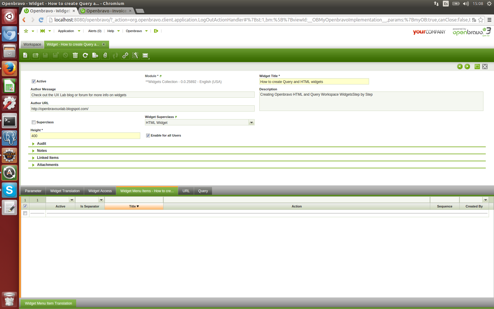 | Steps To Reproduce | 1- Login as System Admin. 2- Go to Widget window and select a widget. 3- Open the Widget Menu Items tab and create a new one checking the "is Separator" checkbox and save it. 4- Try to delete it, but it is not possible. | ||||||||||