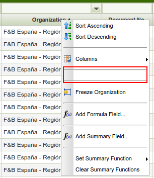 | Steps To Reproduce | 1) Go to the [Sales Invoice] window 2) Remove the implicit filter (by clicking on the funnel icon) and group the grid by organization (right click on the Organization Column > Group by Organization) 3) Save the view as Group1 4) Switch to the standard view. Remove the implicit filters 5) Group the grid by organization and save the view as Group2 6) Close the window and open it again 7) Switch to the standard view. Remove the implicit filters 8) Switch to the Group 1 view. All is correct. 9) Switch to the Group 2 view. Notice that the grouping has disappeared. a) Right click on the organization column. Notice that the ungroup option is still available. The following message appears after ungrouping: "There are more than 1000 records, grouping is disabled for larger datasets", but the current number of records is lower than 1000. b) Right click again. Is not possible to group by organization because the option is missing (see attached) | ||||||||||