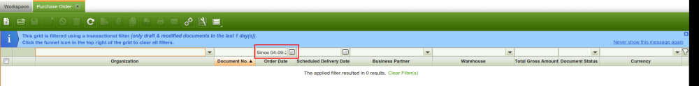 | Steps To Reproduce | 1) Go to the Purchase Order window 2) Remove the implicit filter and add a filter in the order date field, for example: From 09-04-2013 3) Save the view 4) Switch to the standard view, notice that the filter for the standard view has been applied properly, but the date in the order date filter has not been cleared. (See attached) | |||||||