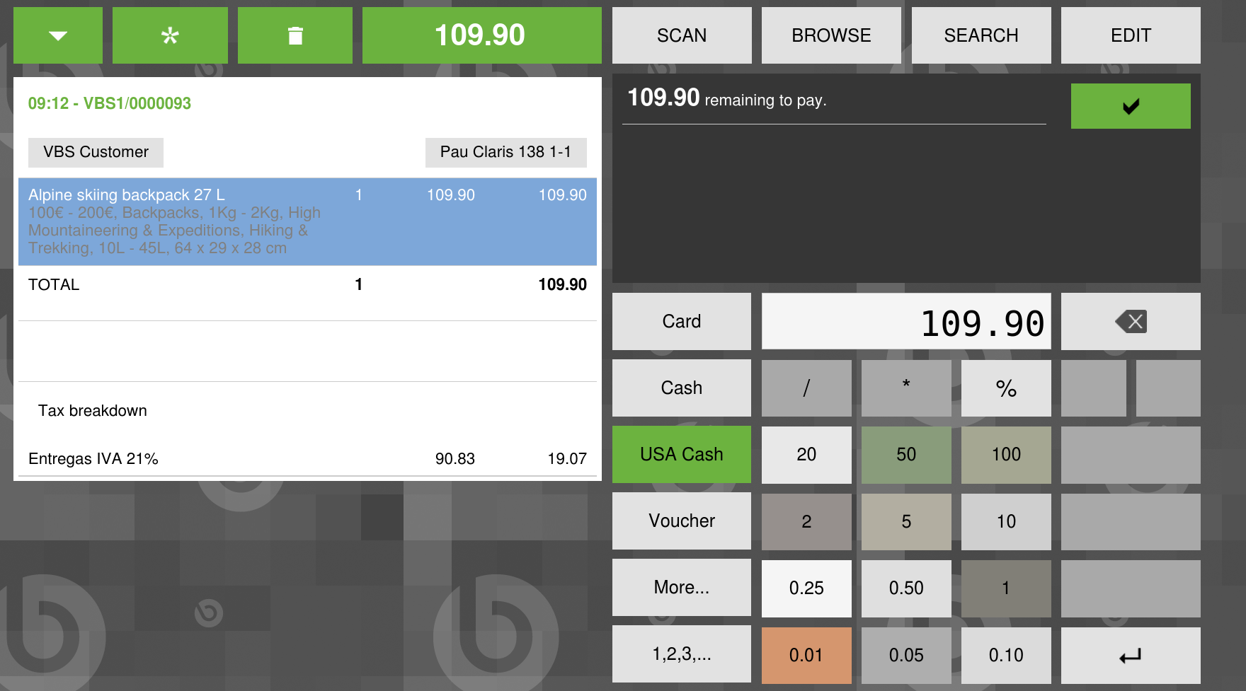 4-Click "USA Cash" button. Just under "Exact amount paid.", click 'X' button. Now it is shown "109.90 remaining to pay." (But this is not $, but €).