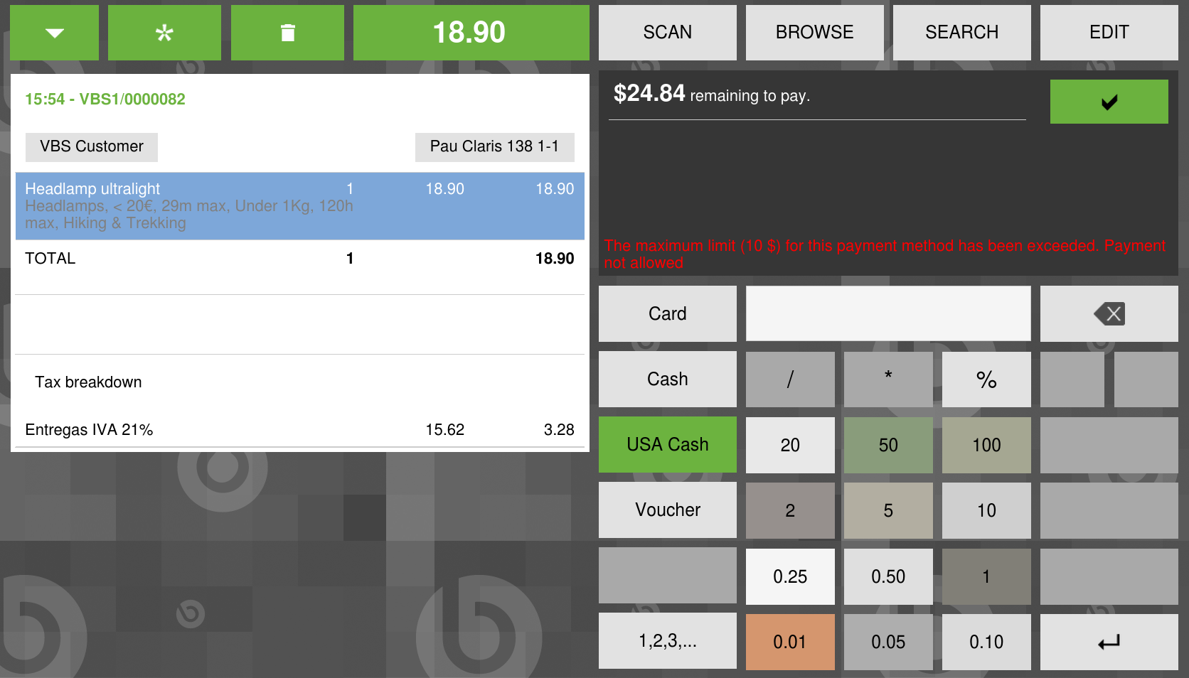 | Steps To Reproduce | Log into the WebPOS In the console, execute this line: OB.MobileApp.model.get('payments')[2].paymentMethod.maxLimitAmount = 10 In the ticket, add products that exceed 10 amount Pay it with USA cash the message displayed is: "The maximum limit (10 $) for this payment method has been exceeded. Payment not allowed" and it should be "The maximum limit ($ 10) for this payment method has been exceeded. Payment not allowed" | |||||||
