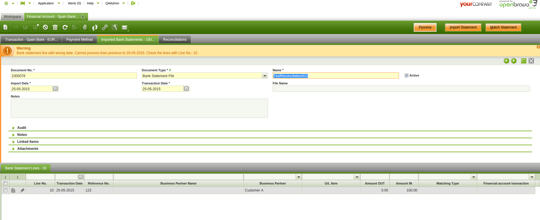 | Steps To Reproduce | 1-Login ERP as Openbravo//openbravo and choose QA Testing Admin role. 2-Go to Financial Account window and select Spain Bank. 3-In Transaction tab, click "Create new record in form" button. Now, fill the following fields: -- Transaction Date: 01-01-CURRENTYEAR Transaction Type: BP Deposit GL Item: Salaries Deposit Amount: 100 -- Process the Transaction 4-Go to Imported Bank Statement tab and click "Create new record in form" button to create a record: -- Name: TestReconciliation001 Transaction Date: 01-01-CURRENTYEAR -- 5-Go to Bank Statement Line tab and click "Create new record in form" button to create a new record: -- Transaction Date: 01-01-CURRENTYEAR Reference No.: 123456 Business Partner: Customer A Amount In: 100 -- Process the Bank Statement (a warning message appears if date requirements are not correct. See attached image. This error must appear. If this does not appear, create a new record similar to those just created to force this error). Defect: This message should be an error message instead of a warning message. | |||||||||||